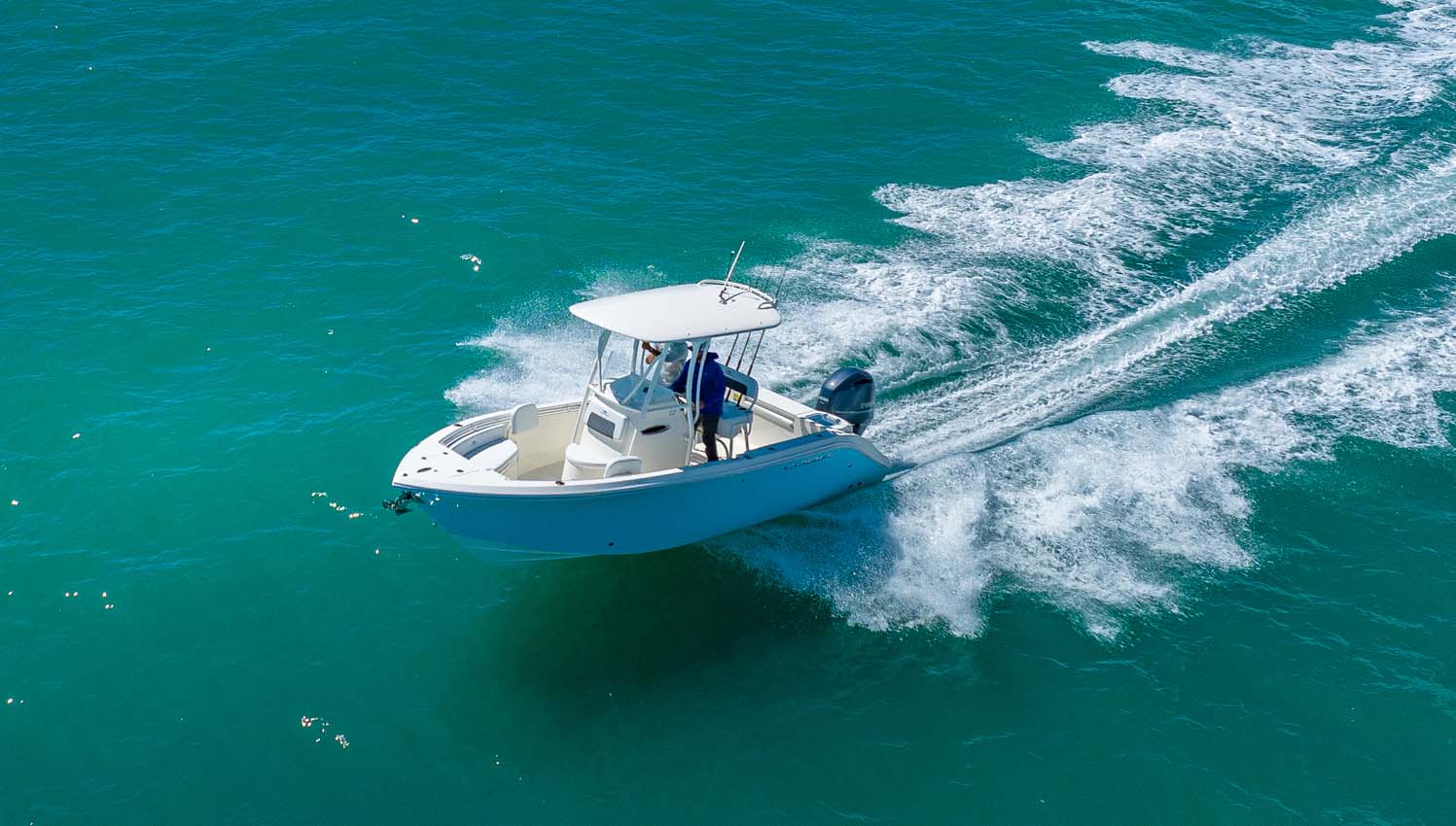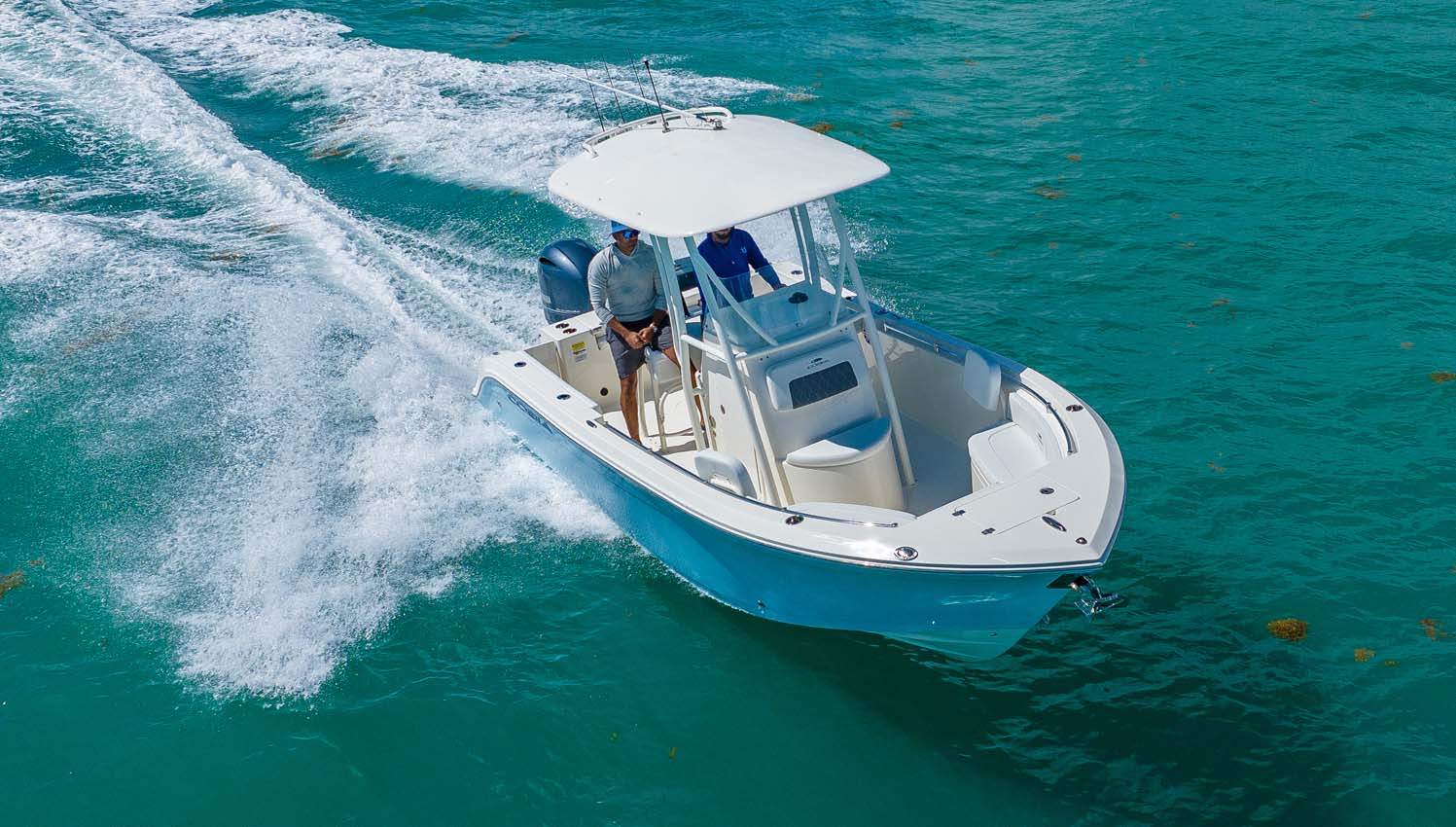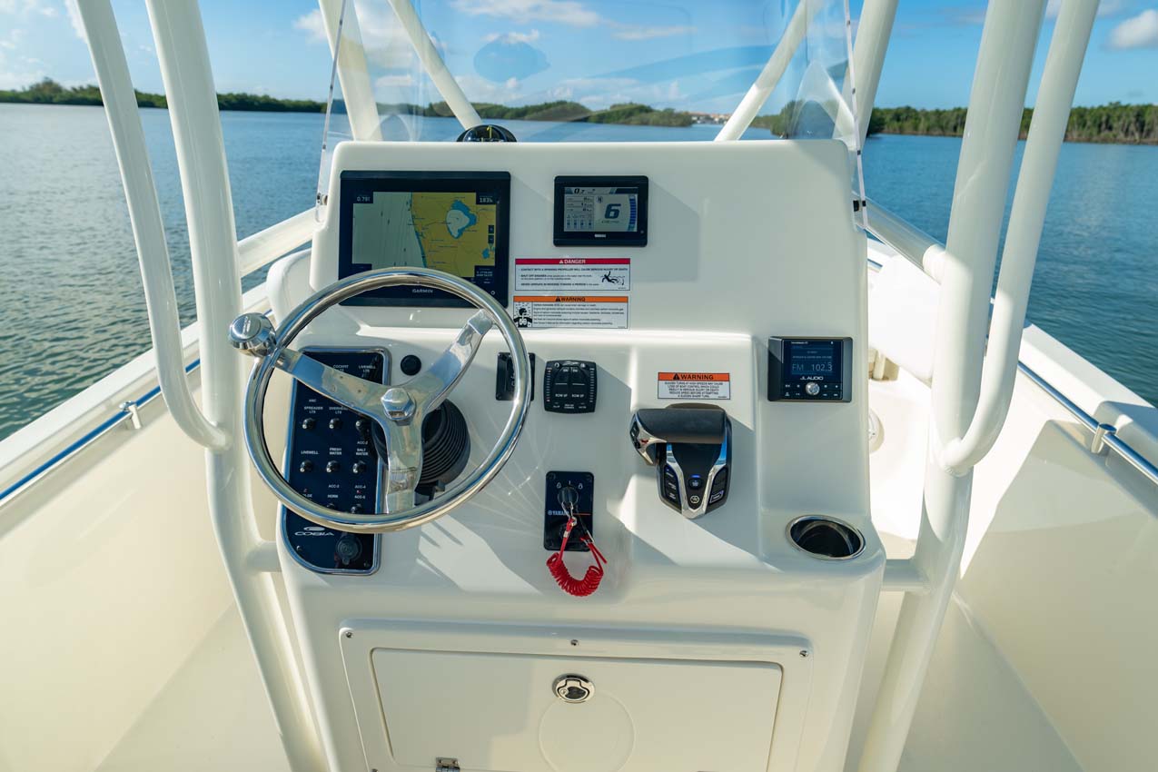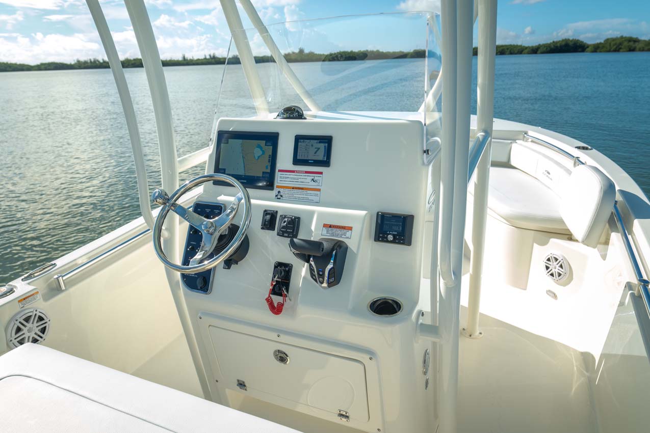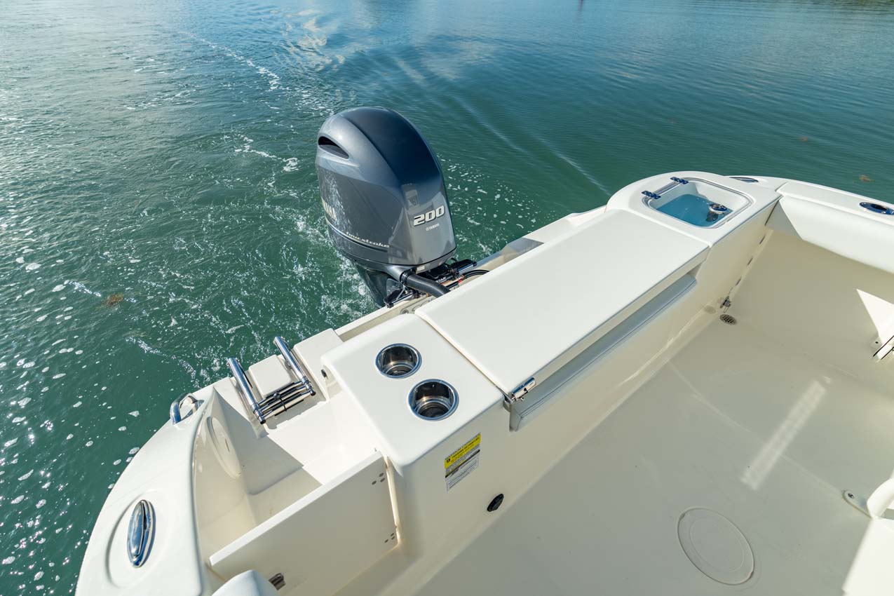 What makes the 220 CC a great center console? Maybe it’s the sharp forward entry, large bow flare and variable deadrise hull that makes it ride better than a lot of bigger boats. Or it could be the high sides and deep interior freeboard that make it feel so secure and safe even in outsized seas. Then there’s the fact that it has an insulated fishbox that drains overboard and under-gunnel rod storage, features that other boats its size can’t claim. And what about the hidden rear seat with flip-up backrest and battery storage underneath? Put it all together and the 220 CC is the most feature-rich and big water-ready 22-footer out there.