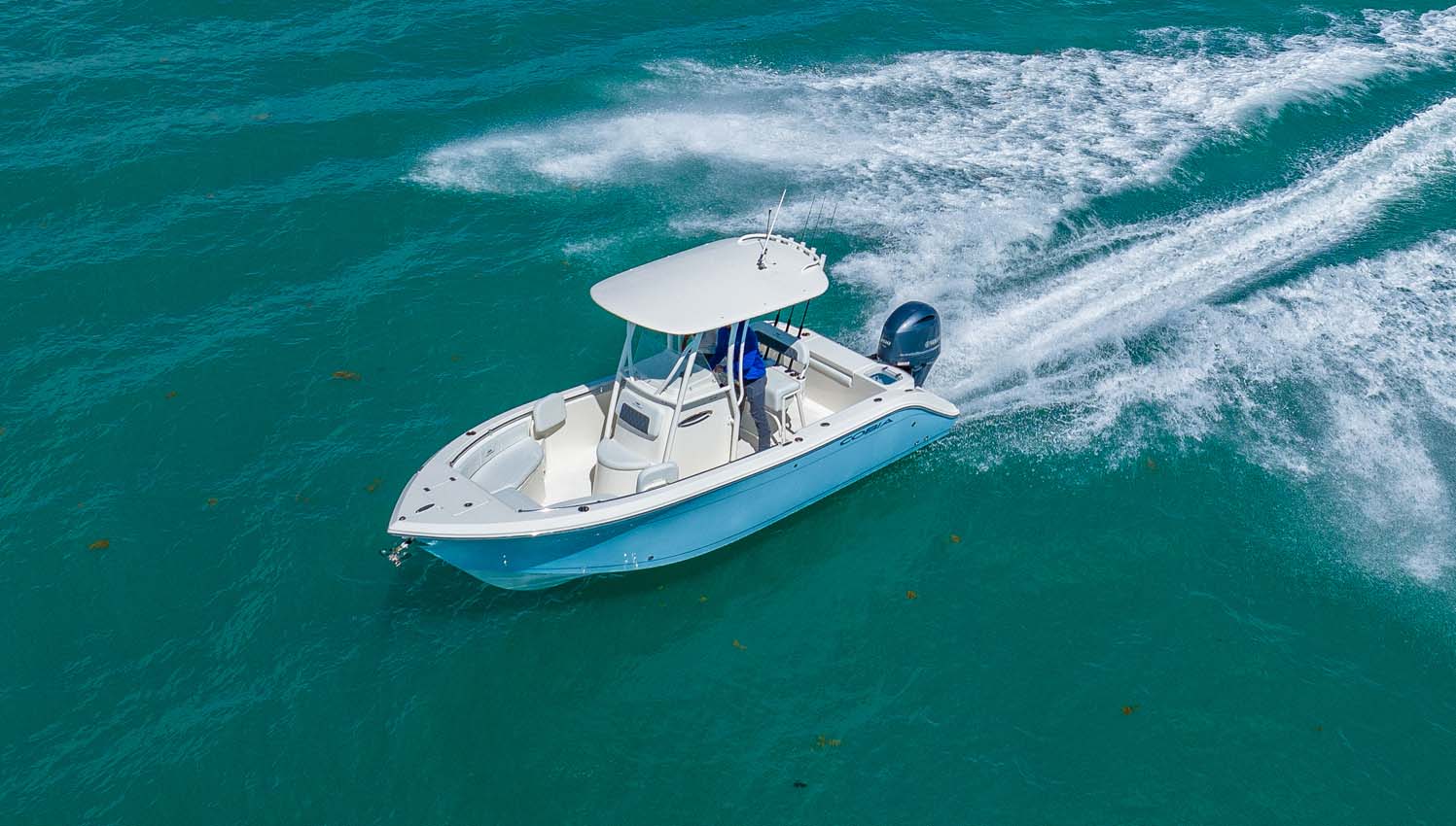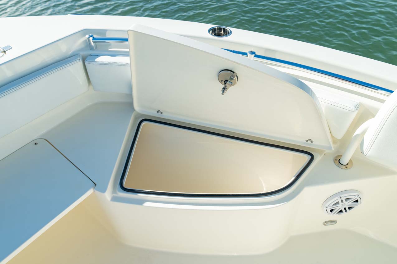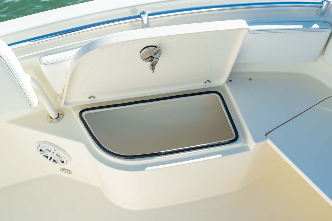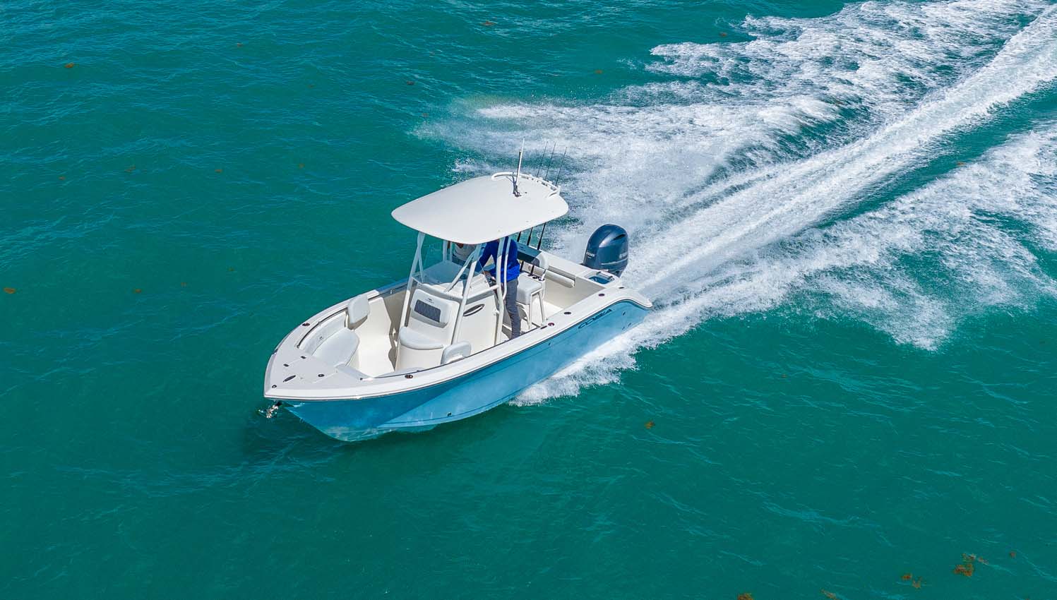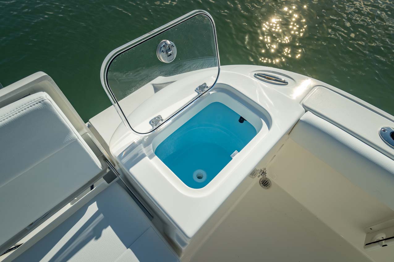What makes the 220 CC a great center console? Maybe it’s the sharp forward entry, large bow flare and variable deadrise hull that makes it ride better than a lot of bigger boats. Or it could be the high sides and deep interior freeboard that make it feel so secure and safe even in outsized seas. Then there’s the fact that it has an insulated fishbox that drains overboard and under-gunnel rod storage, features that other boats its size can’t claim. And what about the hidden rear seat with flip-up backrest and battery storage underneath? Put it all together and the 220 CC is the most feature-rich and big water-ready 22-footer out there.