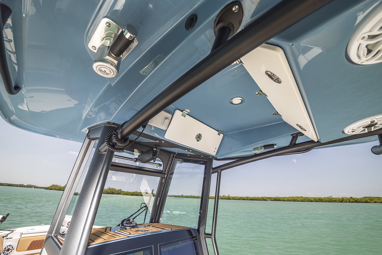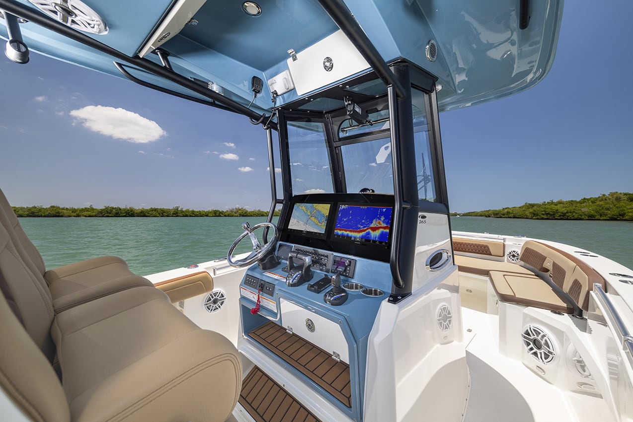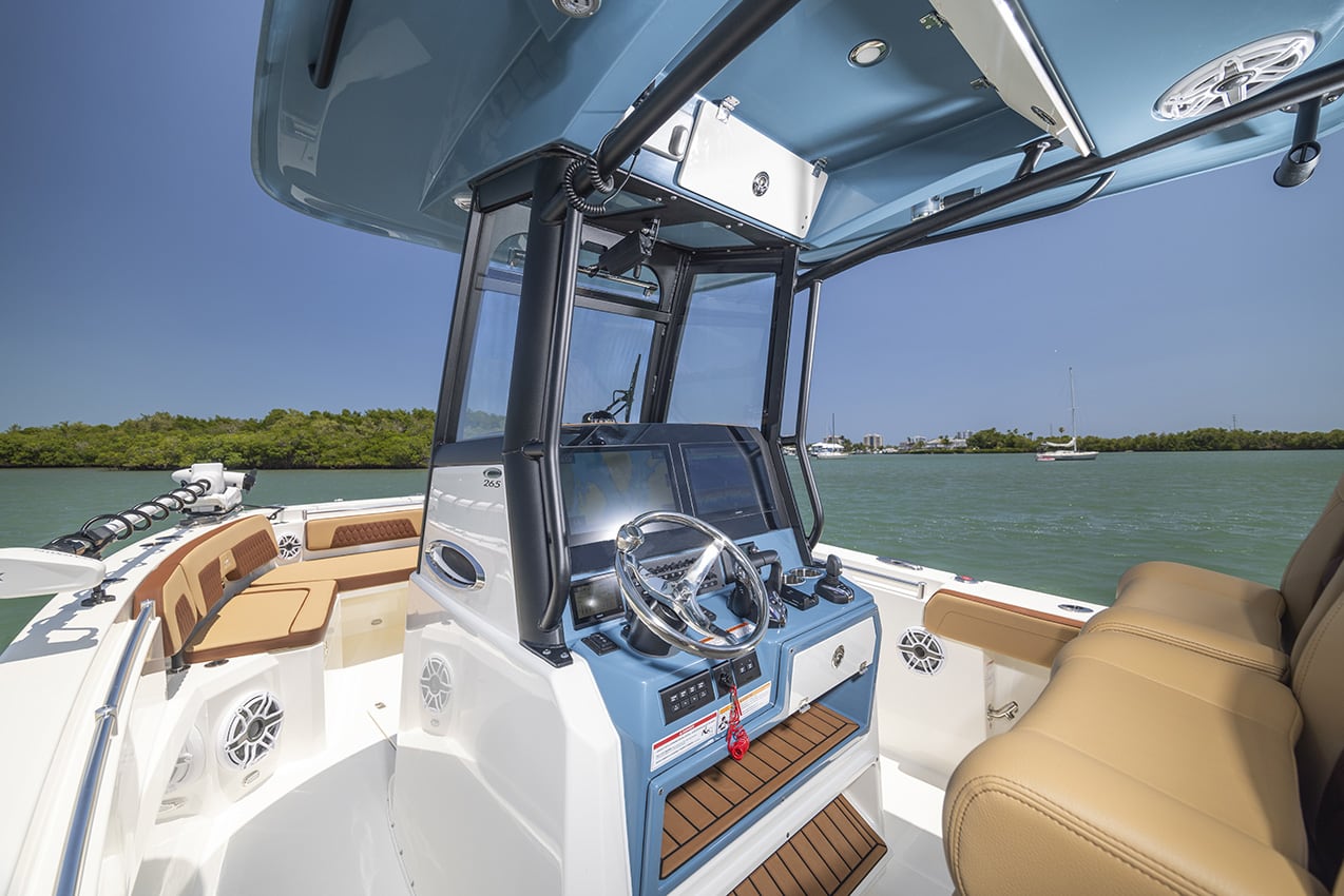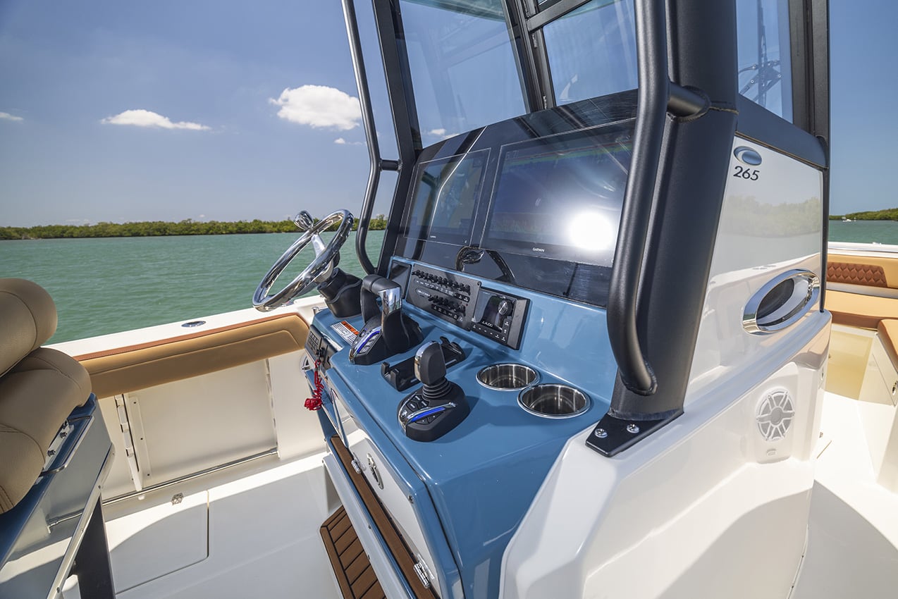 The 265 CC Open takes angling a step further. It builds on the features and innovation of the 265 CC, the inward-opening side entry door; user-friendly helm; available integrated hardtop frame with tempered glass enclosure, wiper and vent; plus, the updated Garmin electronics package offering that can accommodate dual 16″ screens.