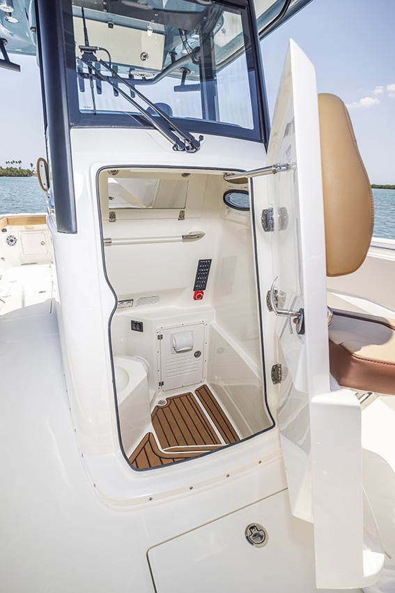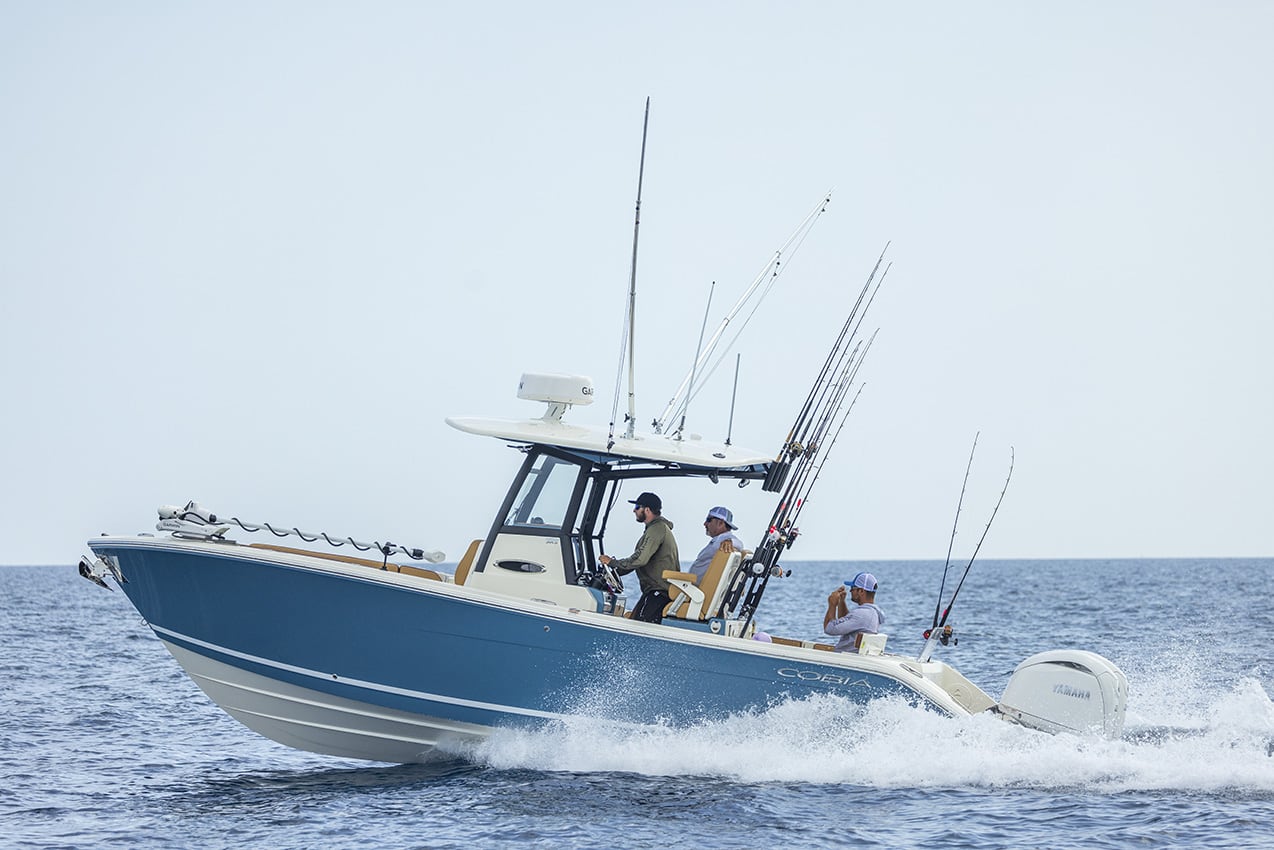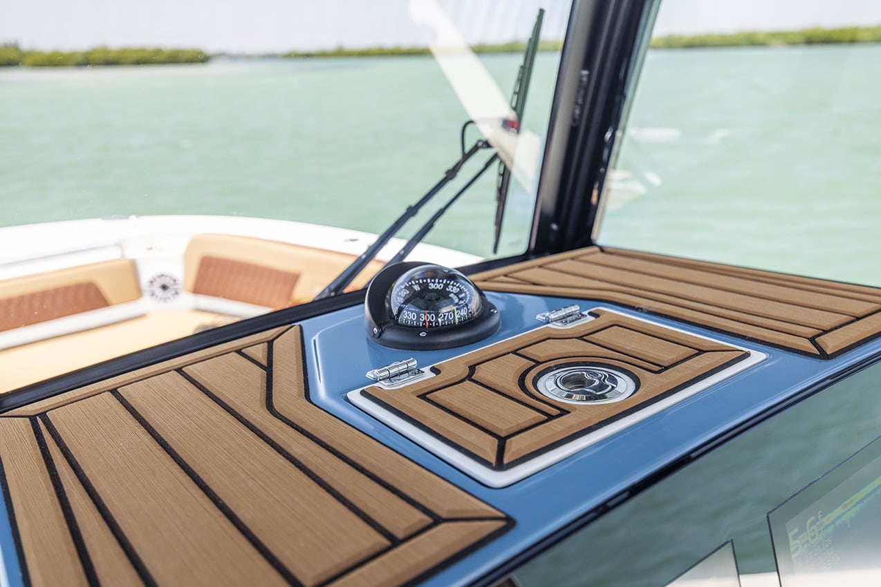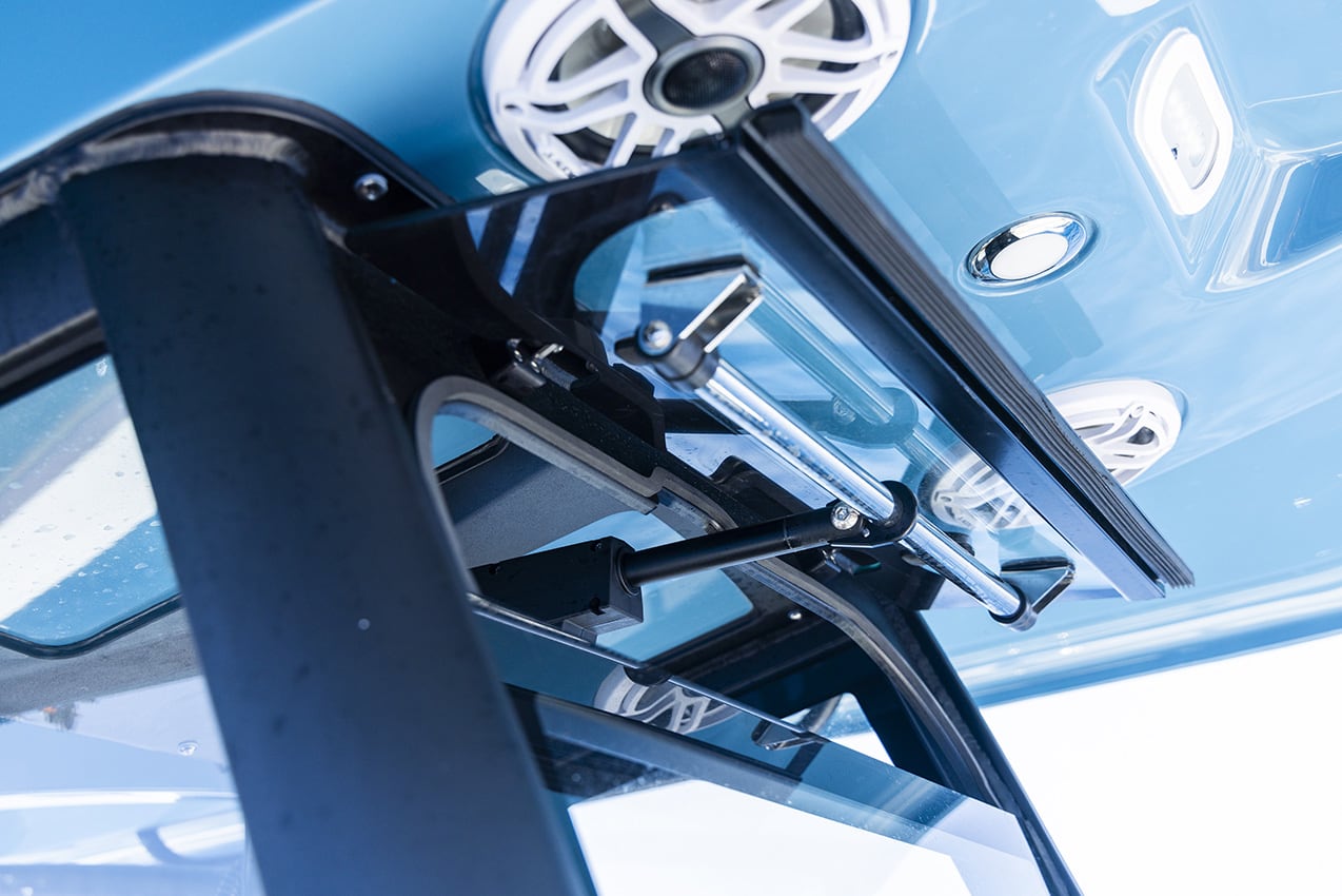 The 265 CC Open takes angling a step further. It builds on the features and innovation of the 265 CC, the inward-opening side entry door; user-friendly helm; available integrated hardtop frame with tempered glass enclosure, wiper and vent; plus, the updated Garmin electronics package offering that can accommodate dual 16″ screens.