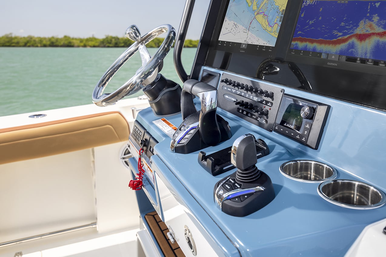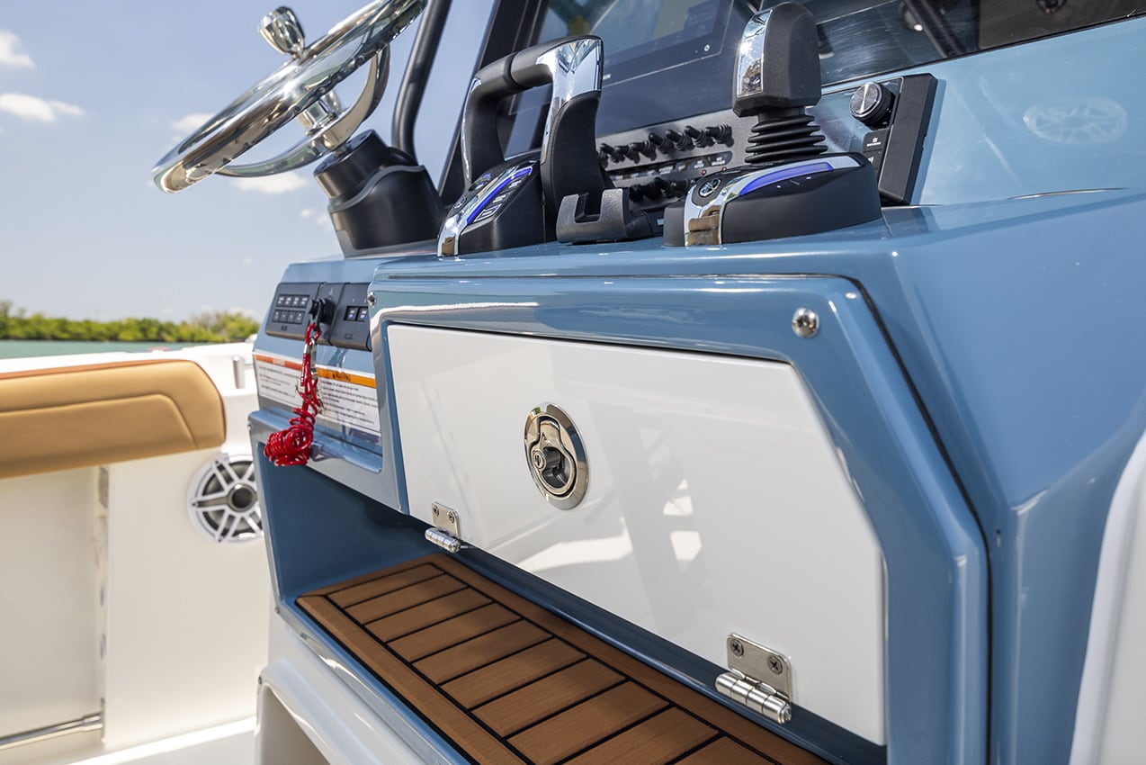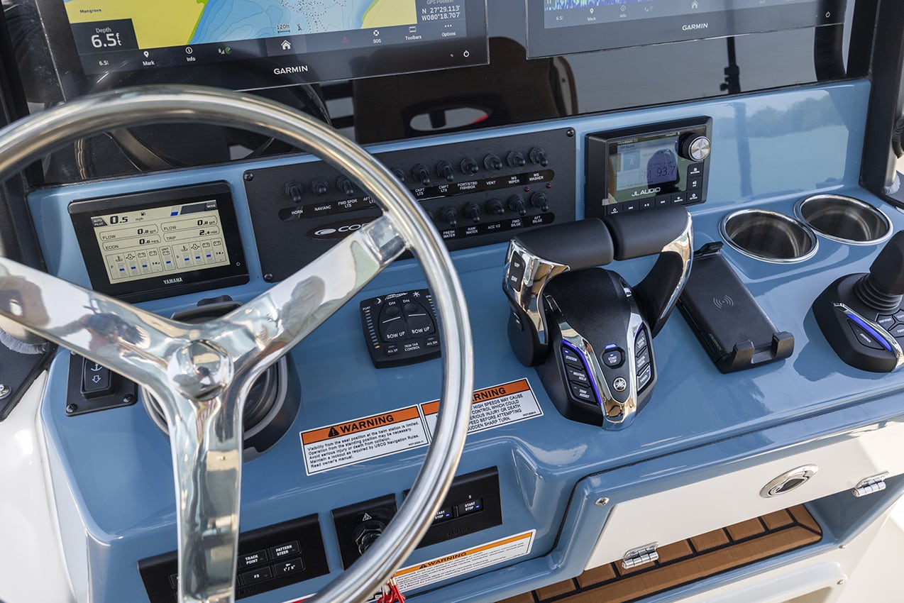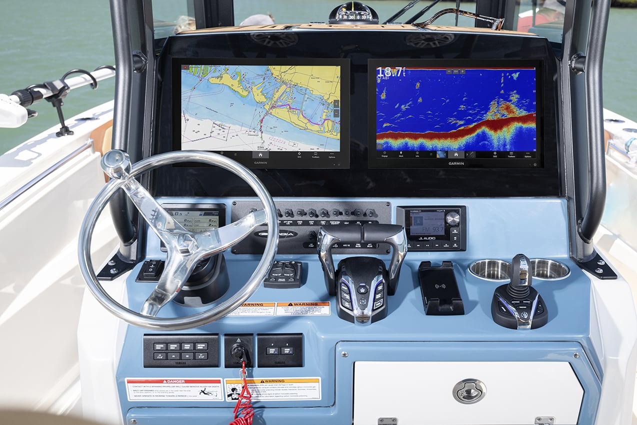 Option the user-friendly helm to fit your needs with room for up to two 16” flush-mounted screens for your Garmin electronics, black acrylic dash, VHF radio, JL Audio sound system control, phone charging station, glove box and more.