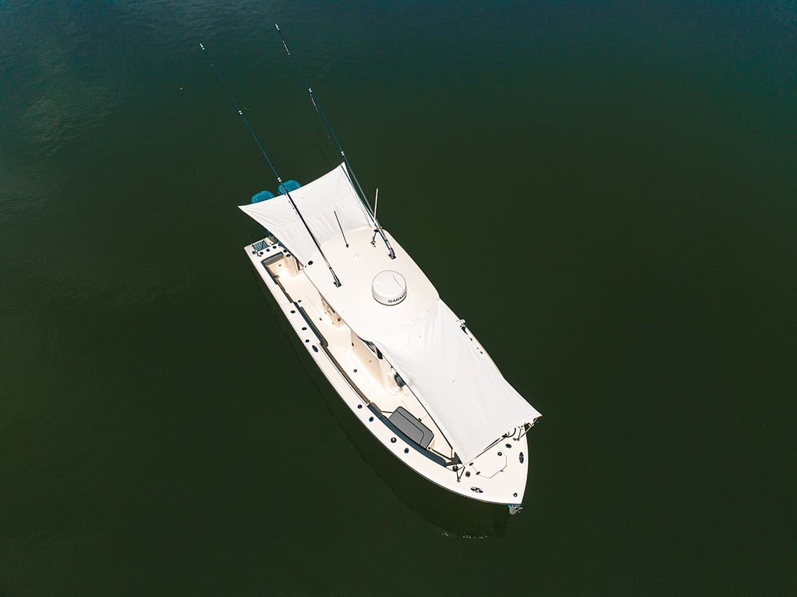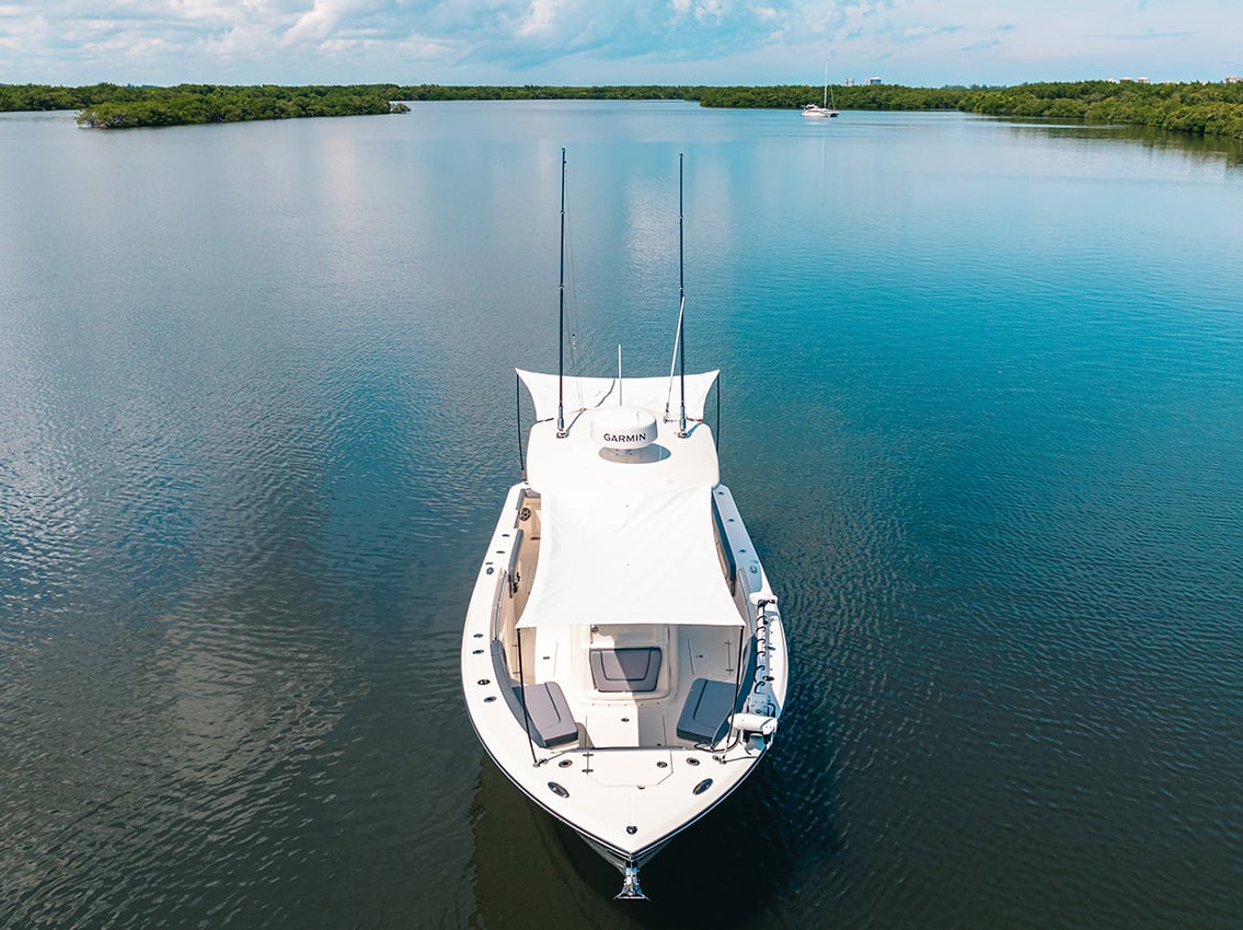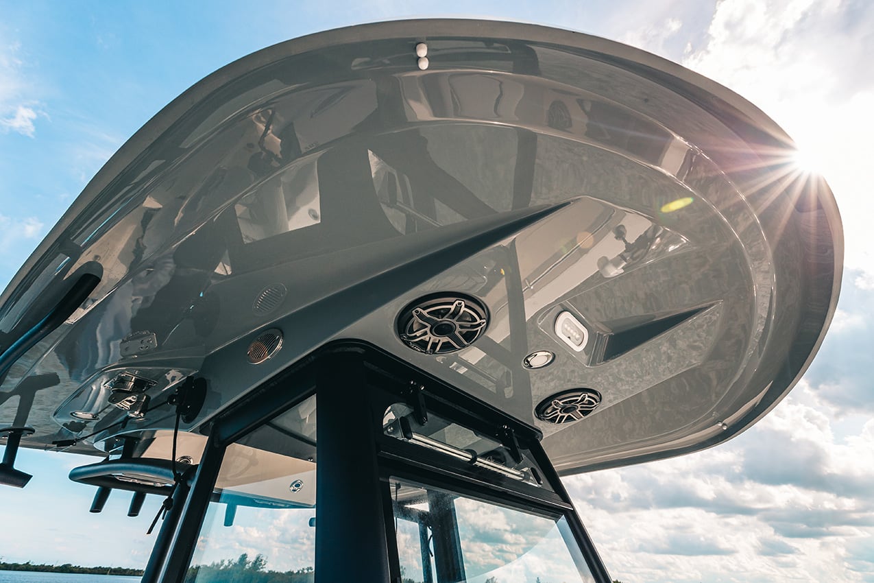 The hardtop provides ample shade on this boat, but when you come in from a day of fishing and want to relax at the sandbar, you still have the option to add the bow and aft canvas sun shade.