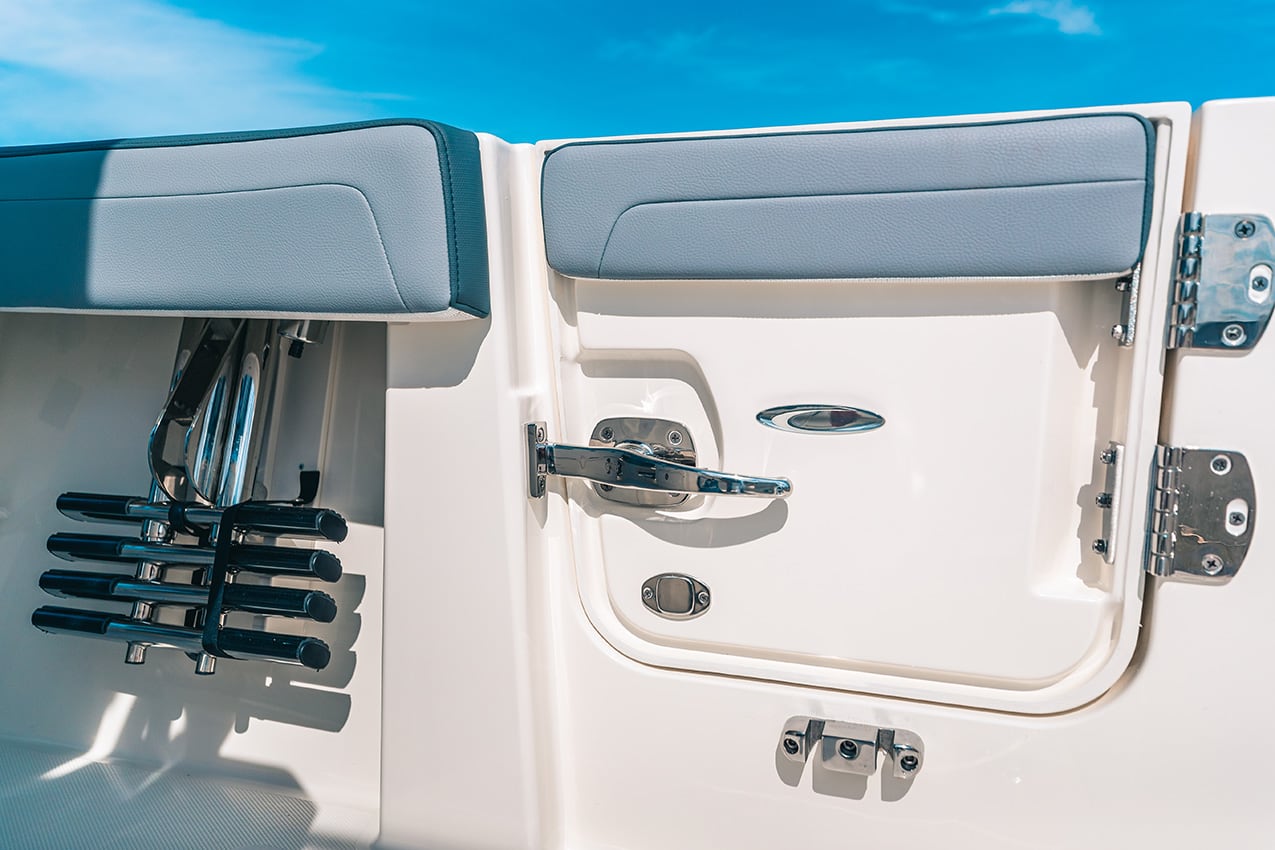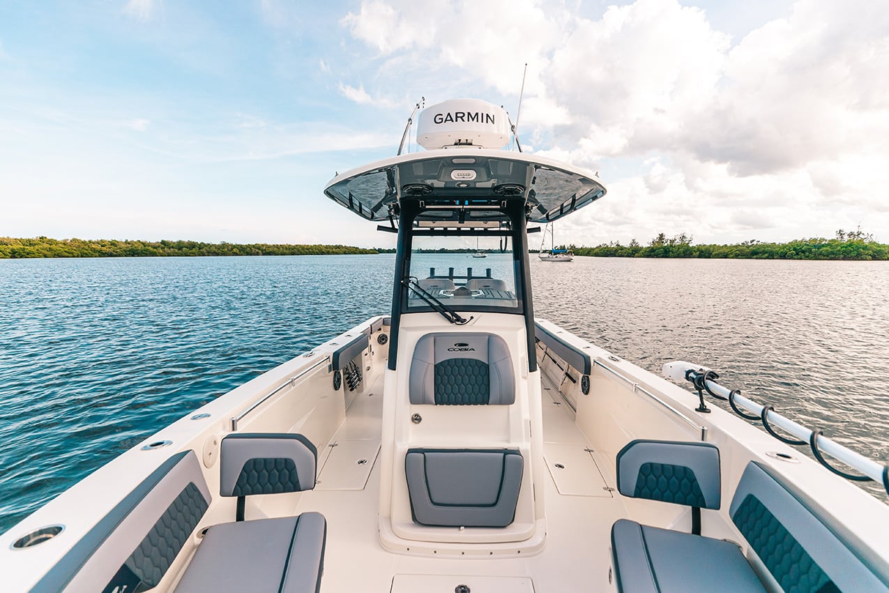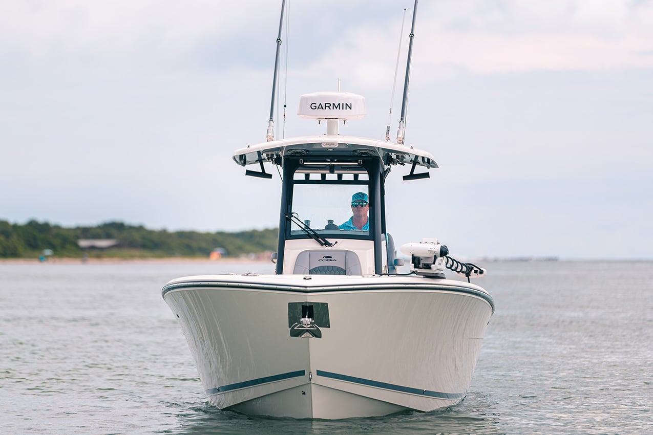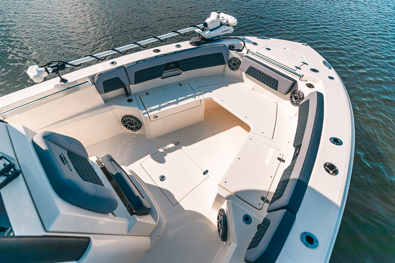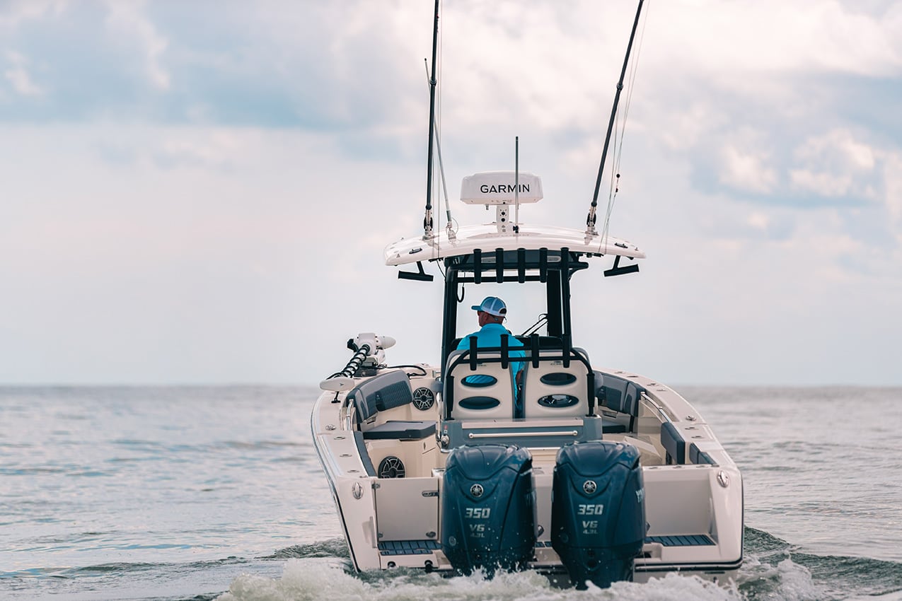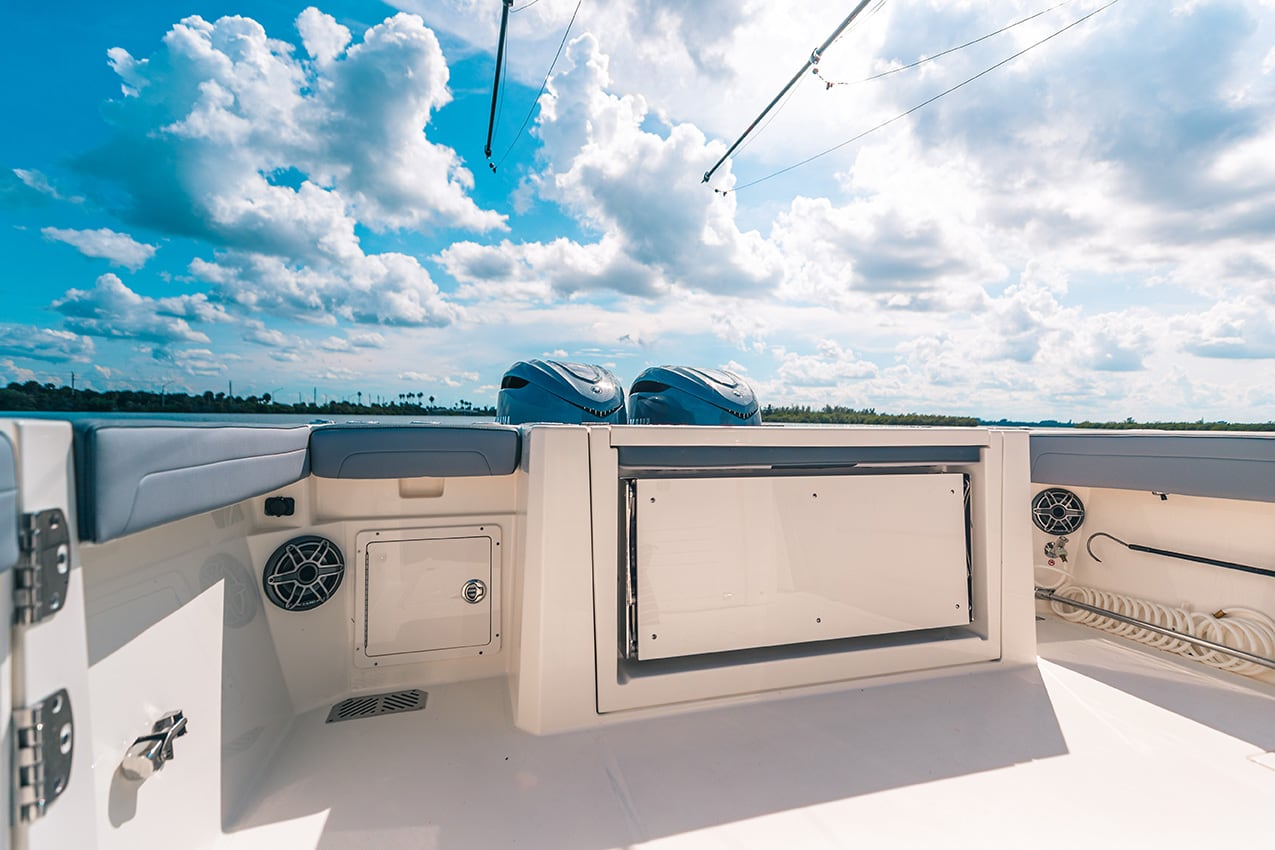 With an LOA of 28’ 5”, a beam of 9’ 11” and versatile seating options, you’ll have plenty of room for all your crew. Get to your favorite spot faster and fish all day with multiple twin engine options – up to 700 maximum horsepower. The helm can accommodate dual 16” Garmin screens, so navigating is second nature. The premium helm seat with tackle center and cooler with slide is standard on the Open or opt in for a version that includes space for more tackle, prep or an added Seakeeper 1.