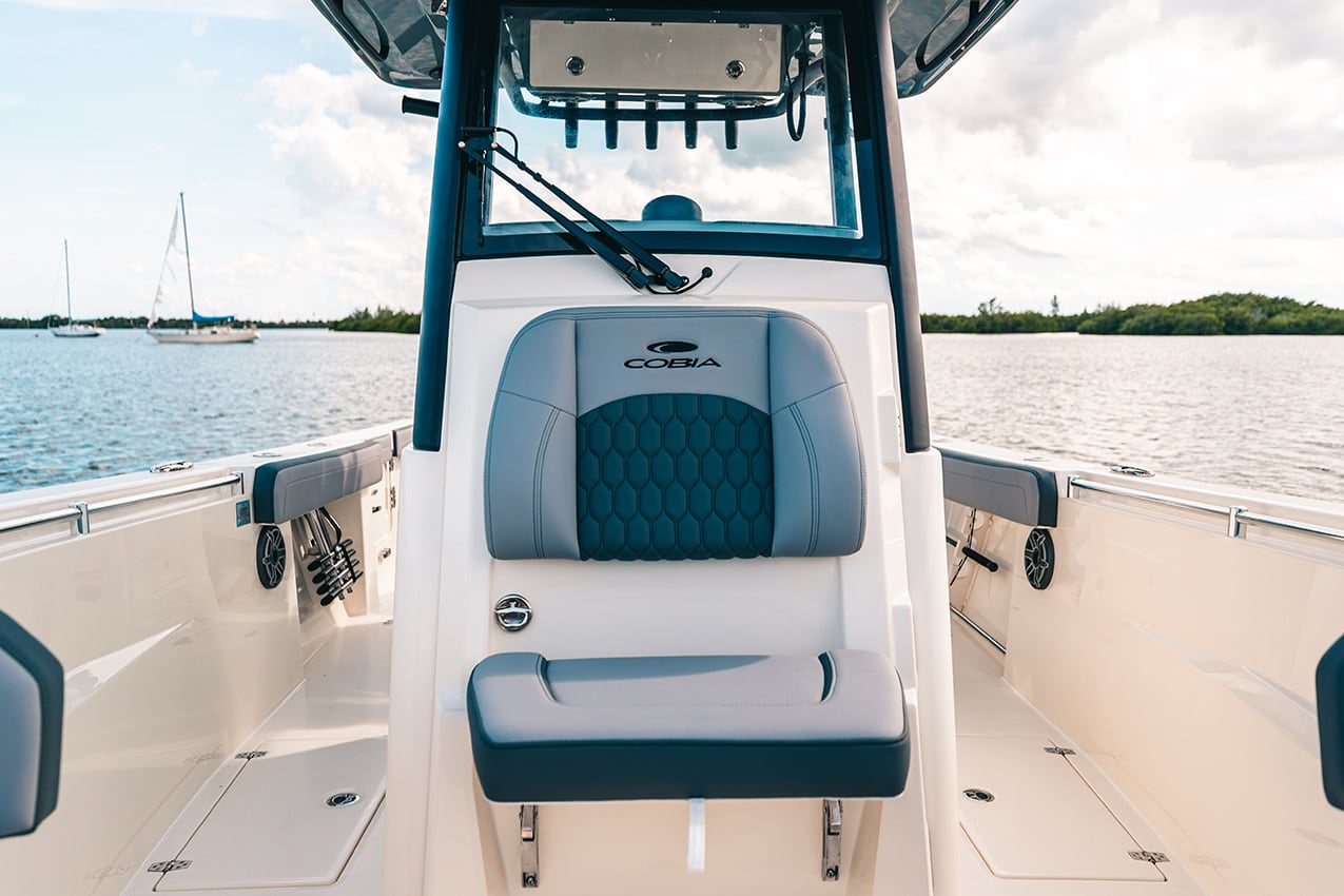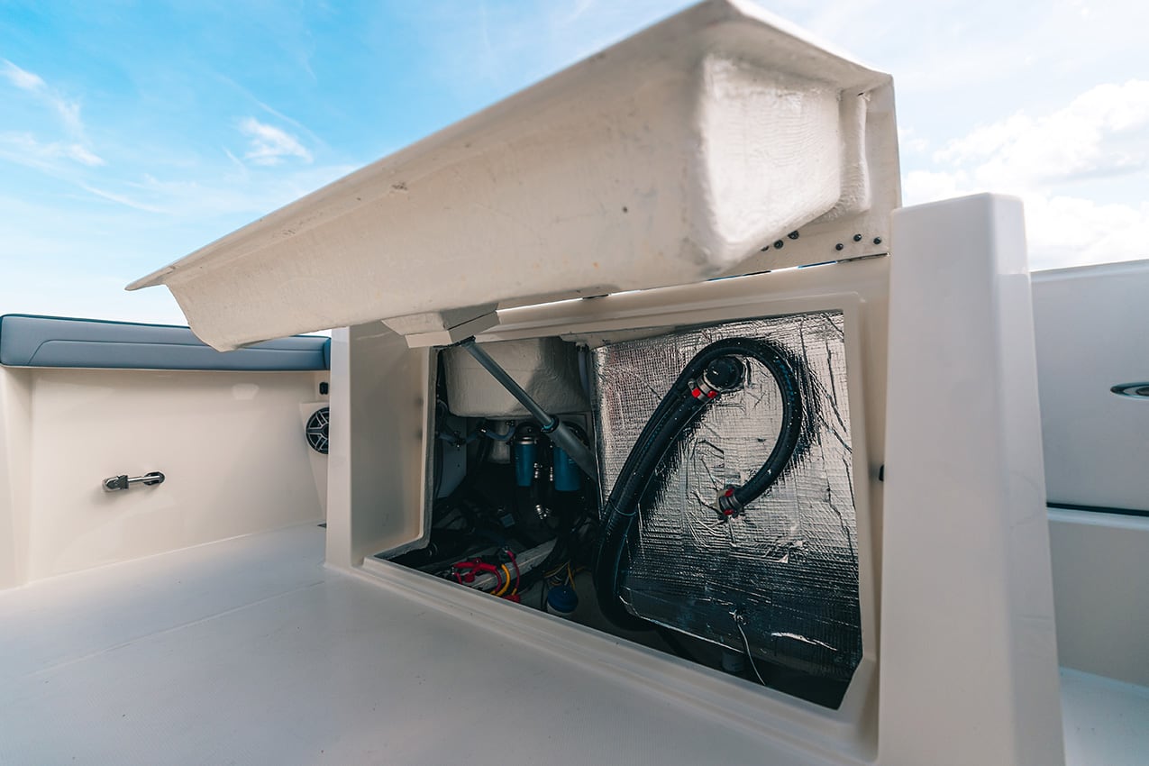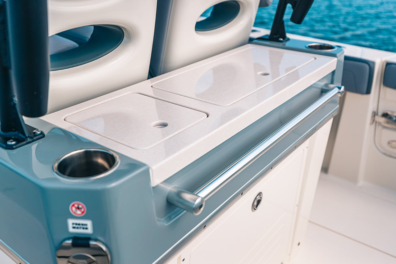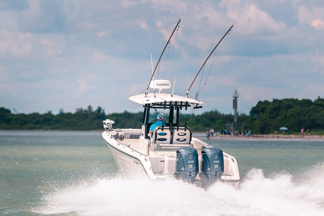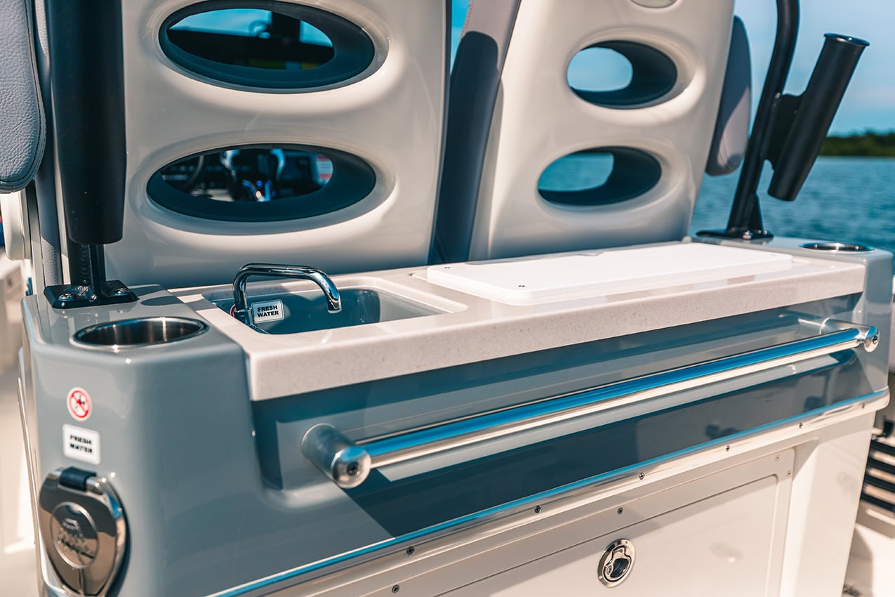 With an LOA of 28’ 5”, a beam of 9’ 11” and versatile seating options, you’ll have plenty of room for all your crew. Get to your favorite spot faster and fish all day with multiple twin engine options – up to 700 maximum horsepower. The helm can accommodate dual 16” Garmin screens, so navigating is second nature. The premium helm seat with tackle center and cooler with slide is standard on the Open or opt in for a version that includes space for more tackle, prep or an added Seakeeper 1.