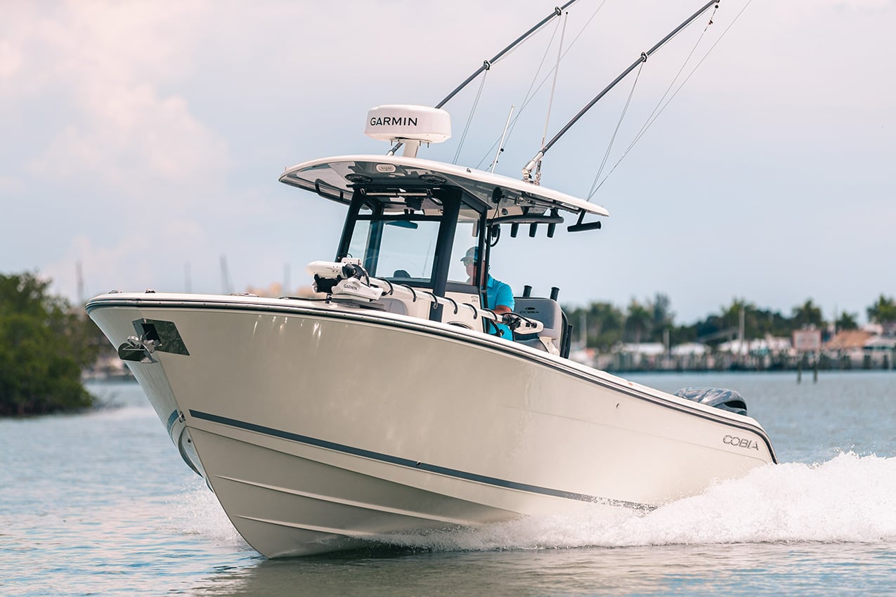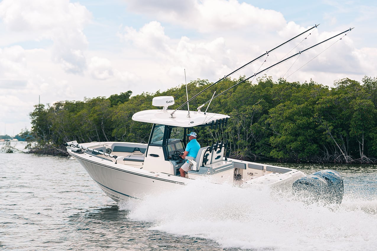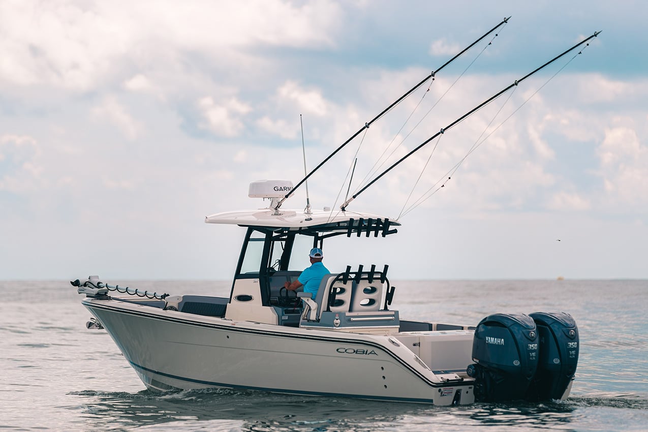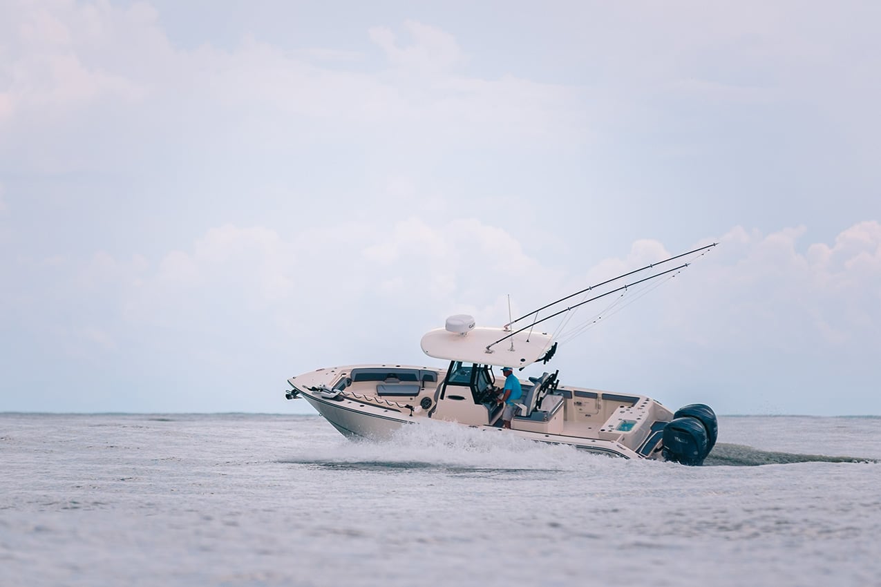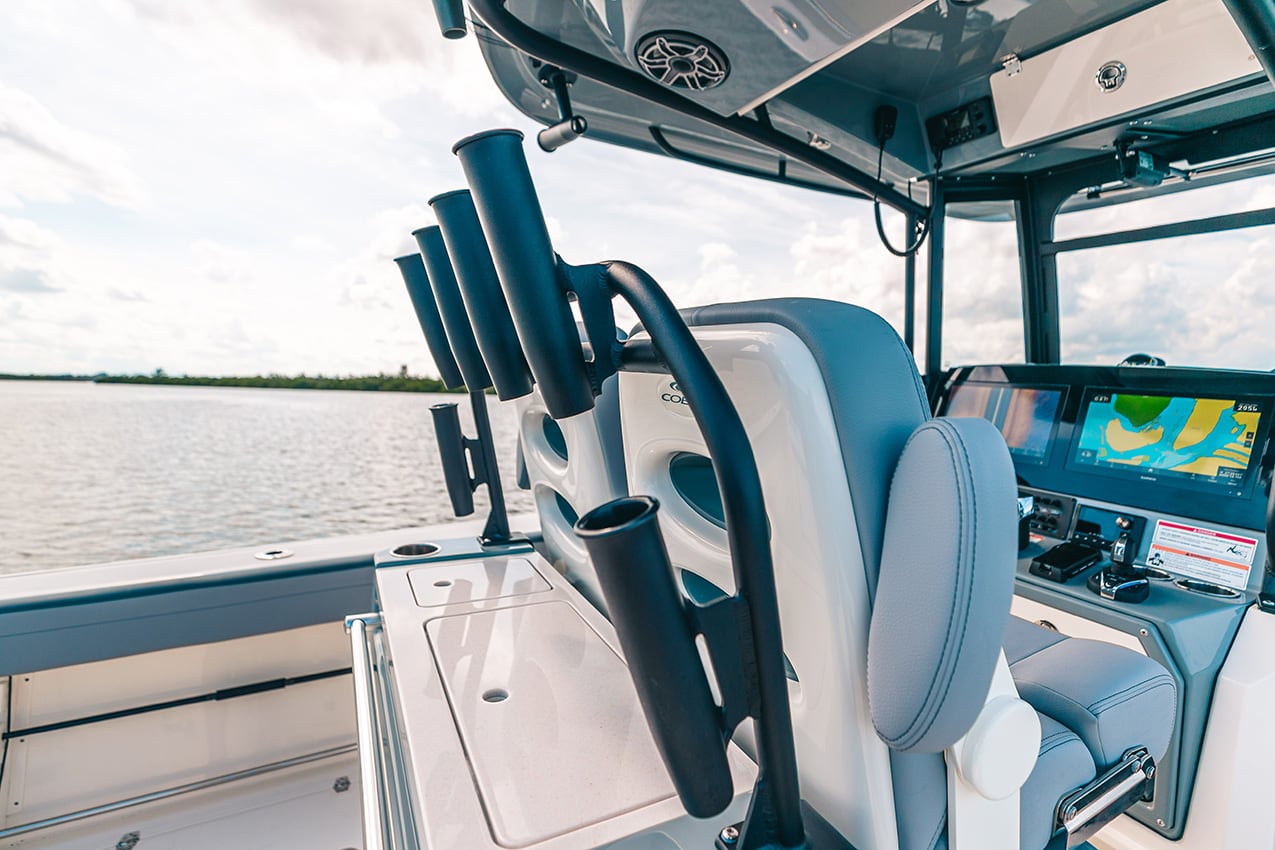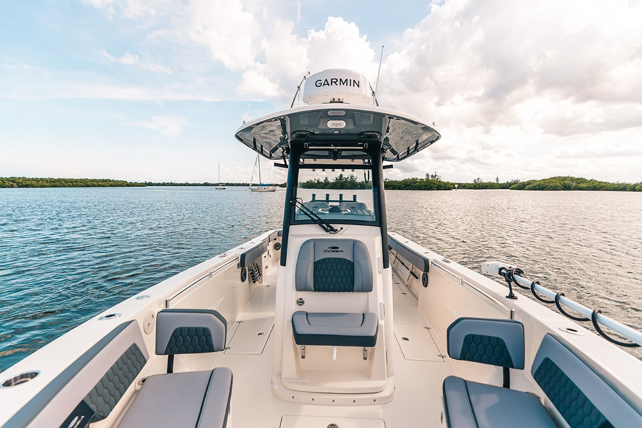 With an LOA of 28’ 5”, a beam of 9’ 11” and versatile seating options, you’ll have plenty of room for all your crew. Get to your favorite spot faster and fish all day with multiple twin engine options – up to 700 maximum horsepower. The helm can accommodate dual 16” Garmin screens, so navigating is second nature. The premium helm seat with tackle center and cooler with slide is standard on the Open or opt in for a version that includes space for more tackle, prep or an added Seakeeper 1.