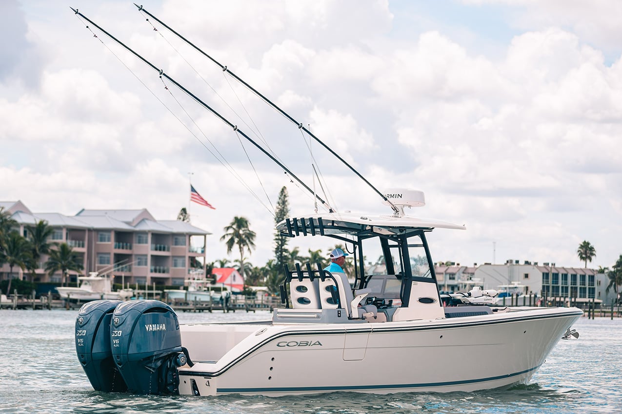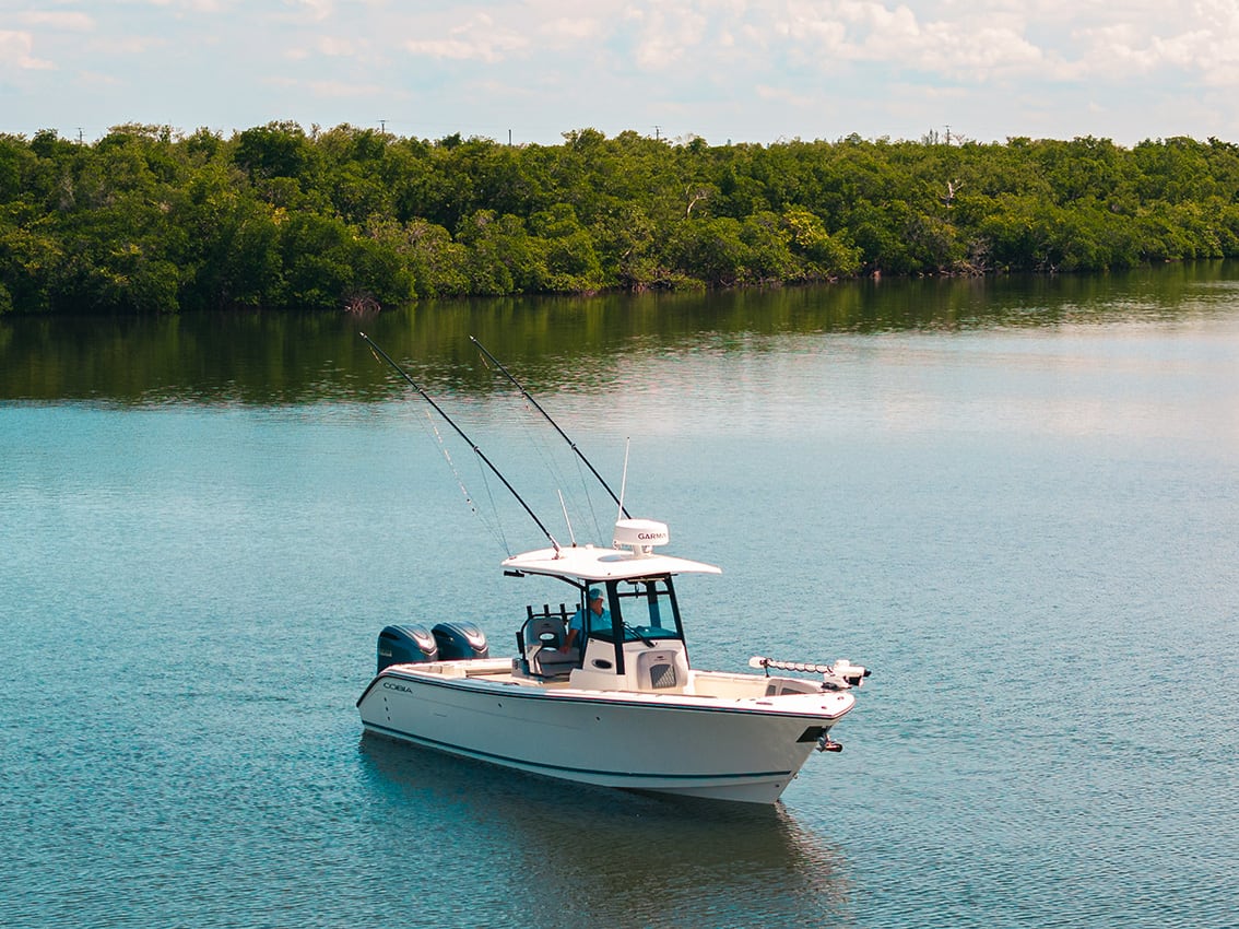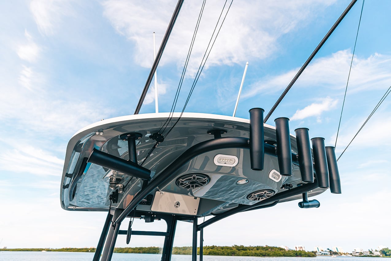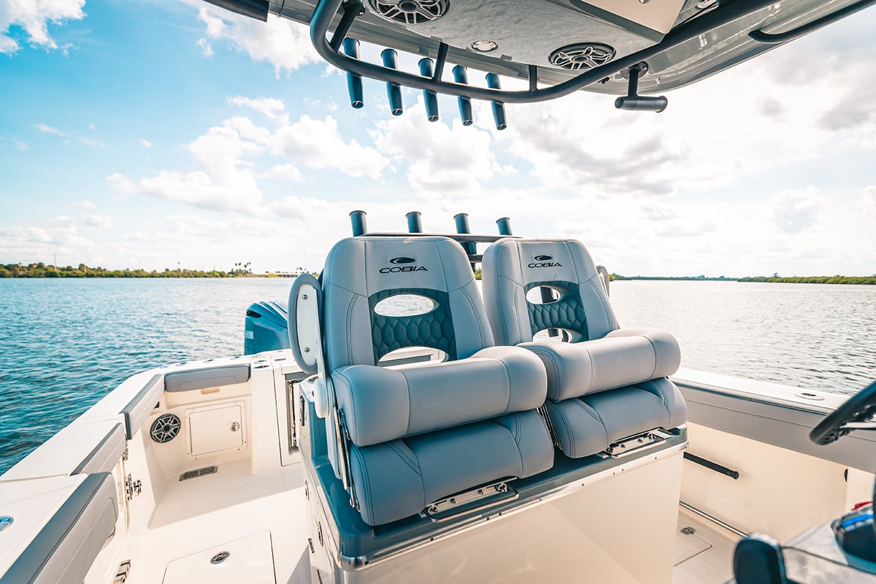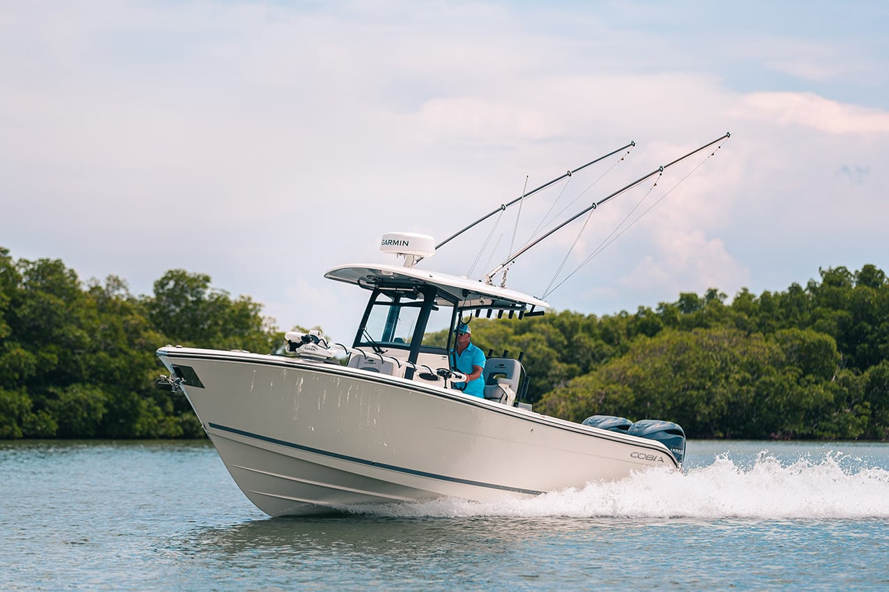 With an LOA of 28’ 5”, a beam of 9’ 11” and versatile seating options, you’ll have plenty of room for all your crew. Get to your favorite spot faster and fish all day with multiple twin engine options – up to 700 maximum horsepower. The helm can accommodate dual 16” Garmin screens, so navigating is second nature. The premium helm seat with tackle center and cooler with slide is standard on the Open or opt in for a version that includes space for more tackle, prep or an added Seakeeper 1.