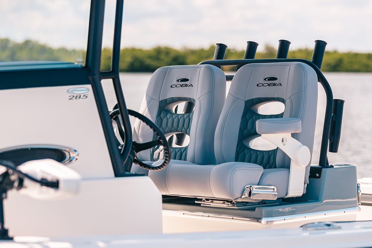 Helm seating on the 285 Open comes standard with a premium tackle station with cooler and slide or opt in for a version that includes space for more tackle, prep or an added Seakeeper1.