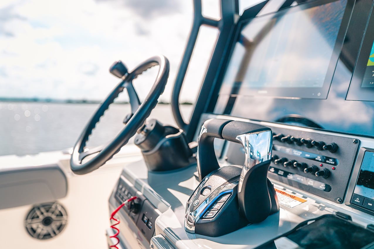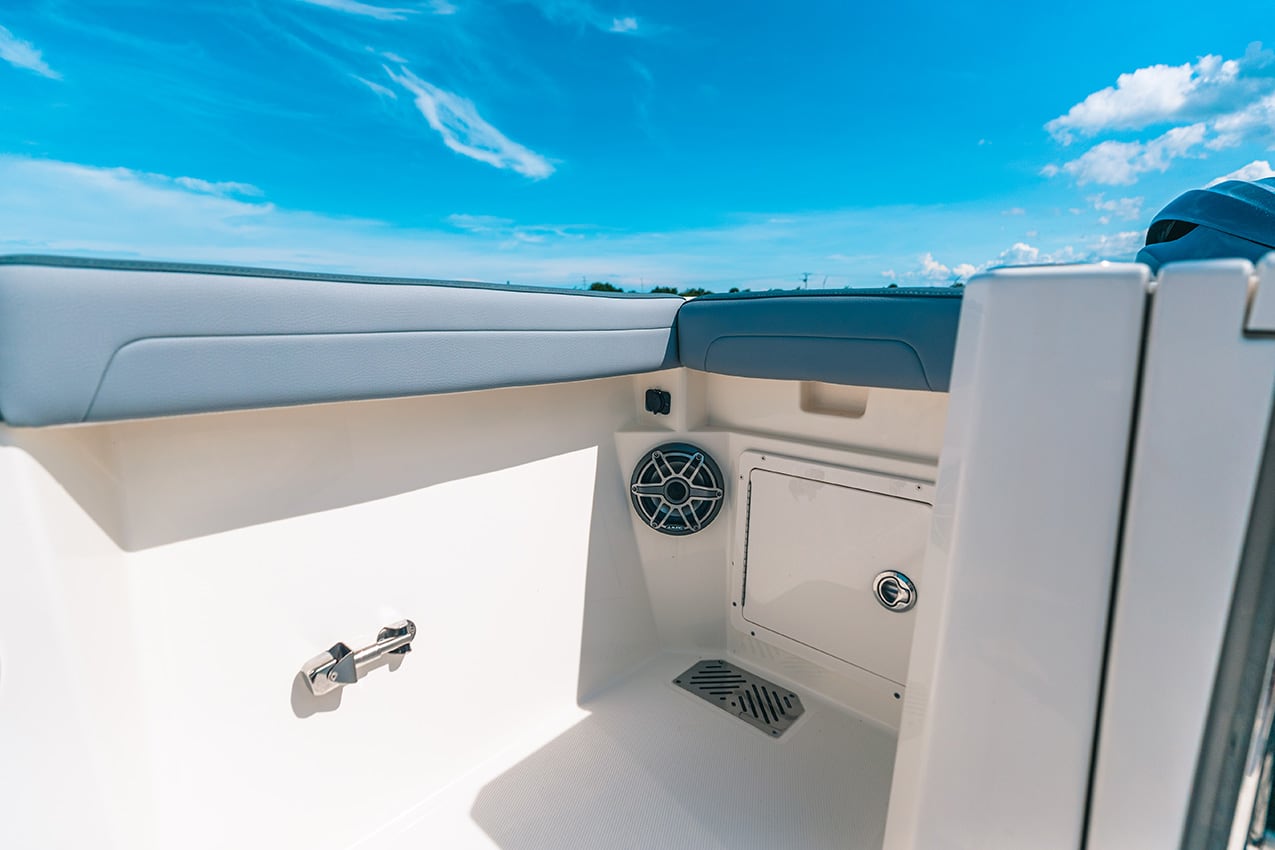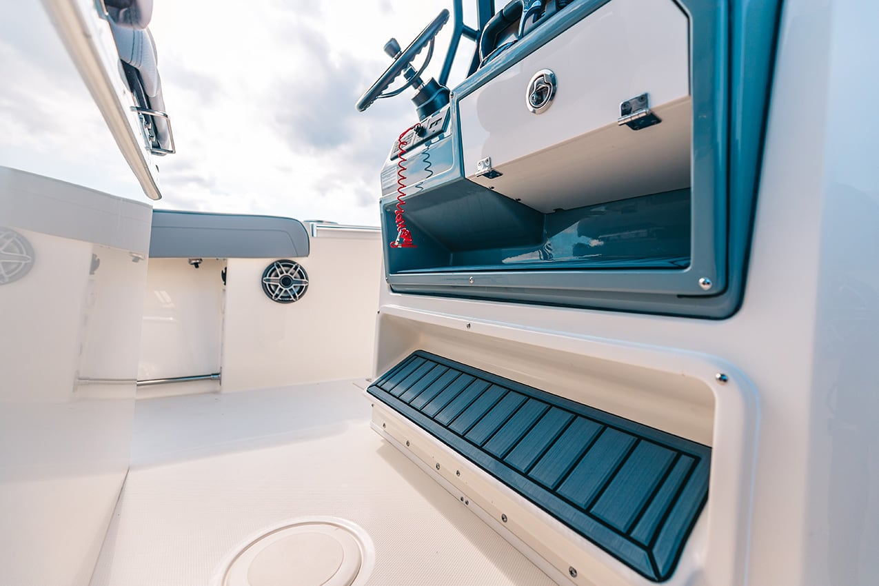 Option the user-friendly helm to fit your needs with room for dual 16″ flush-mounted screens for your Garmin electronics, black acrylic dash, VHF Radio, JL Audio sound system control, phone charging station, glove box and more.