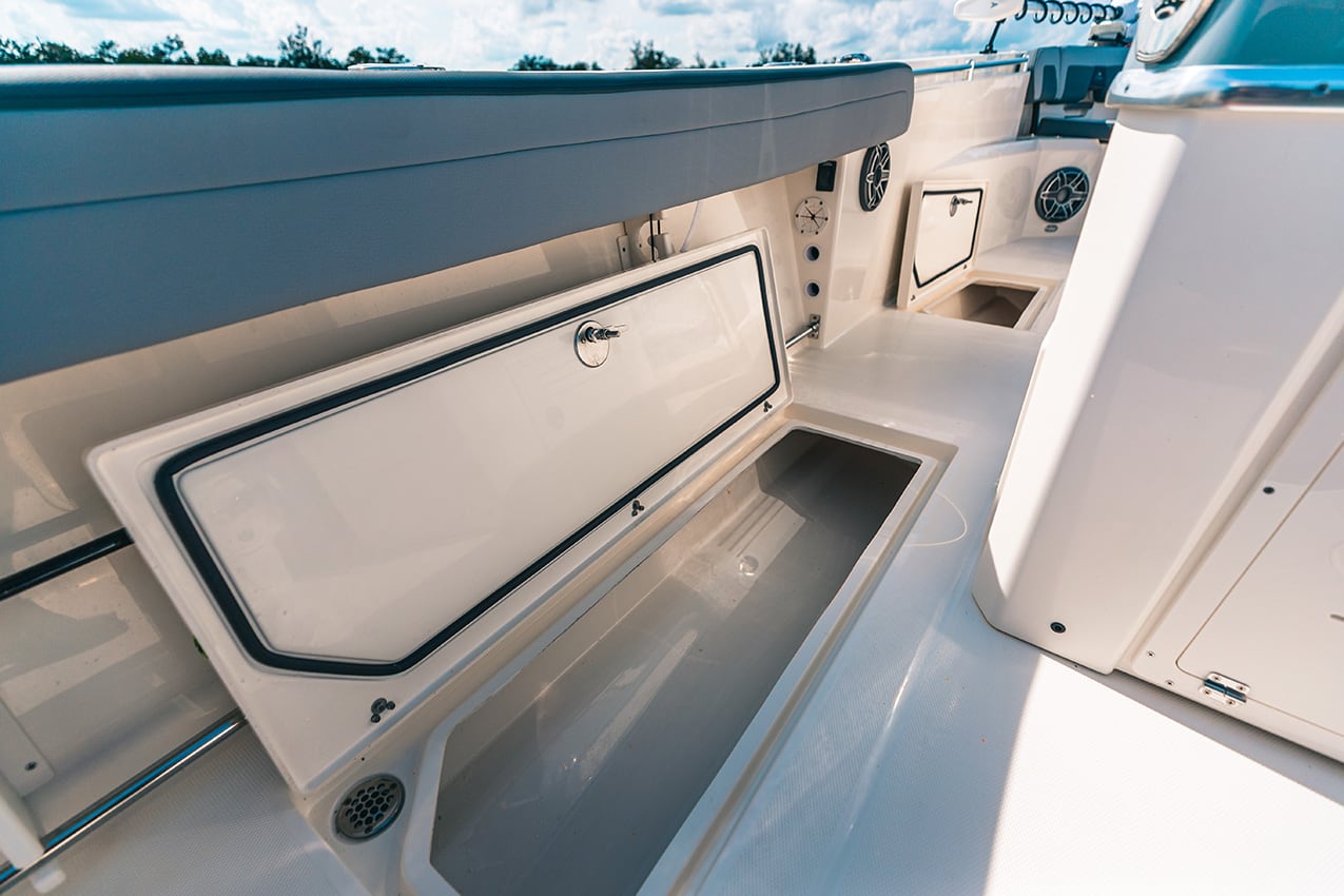 An enhanced angler-friendly layout features 4 cockpit insulated fish boxes with macerated overboard drains and a spacious deck with plenty of room to fight that fish from every side of the boat.