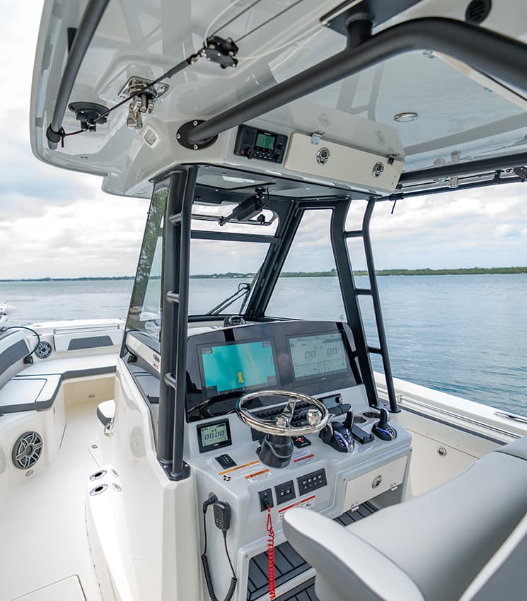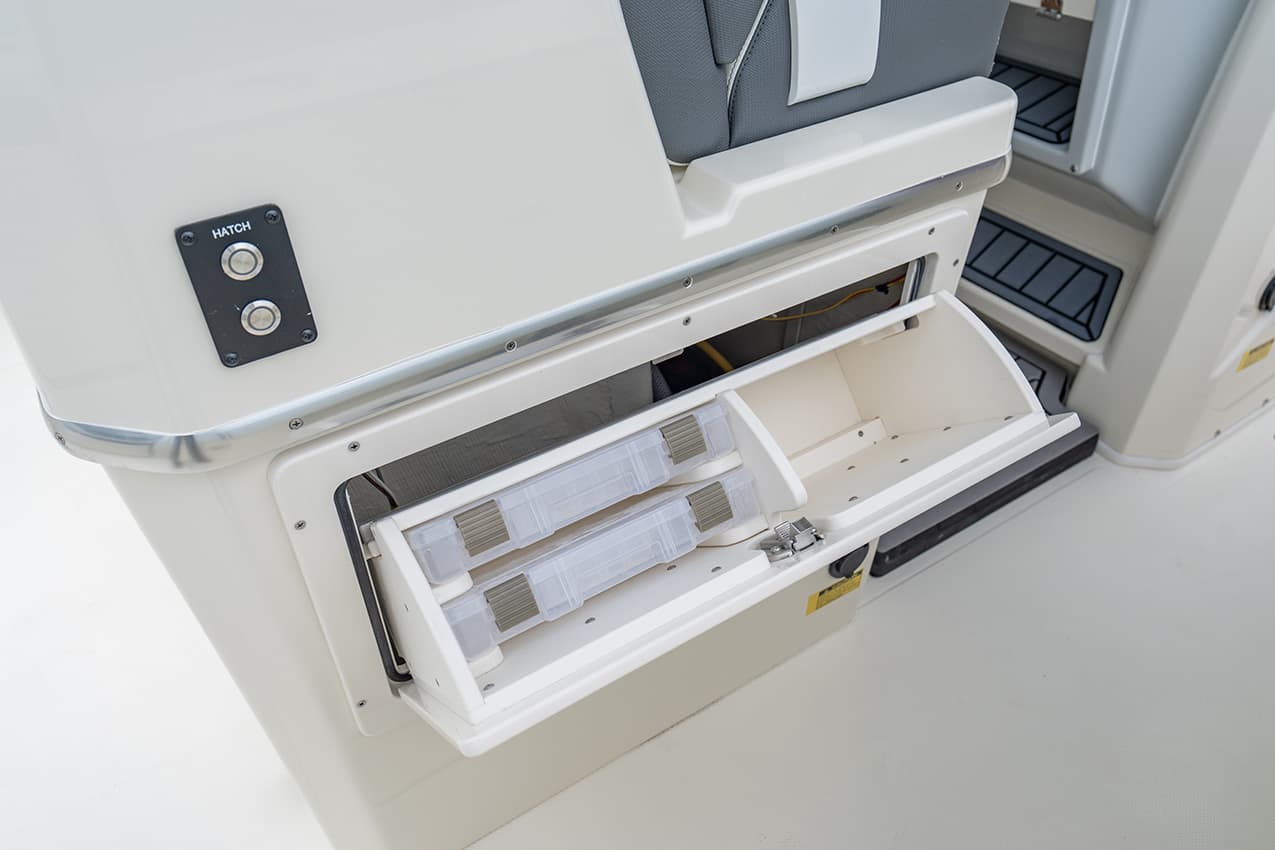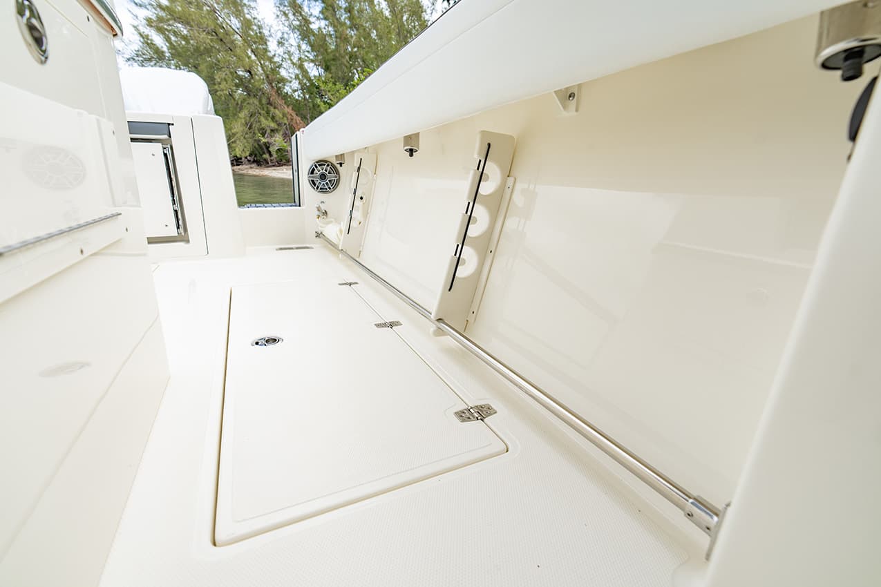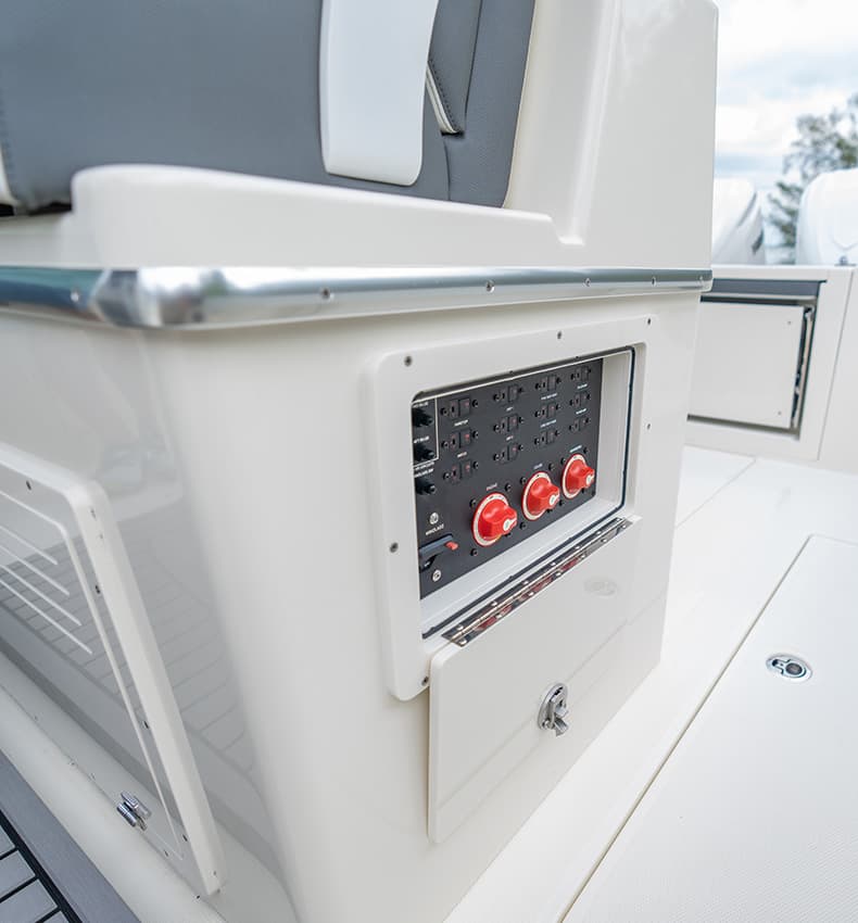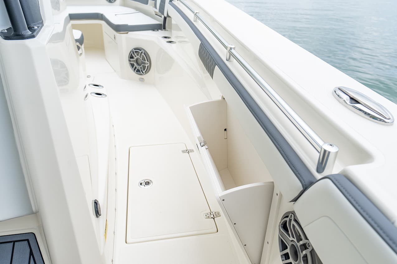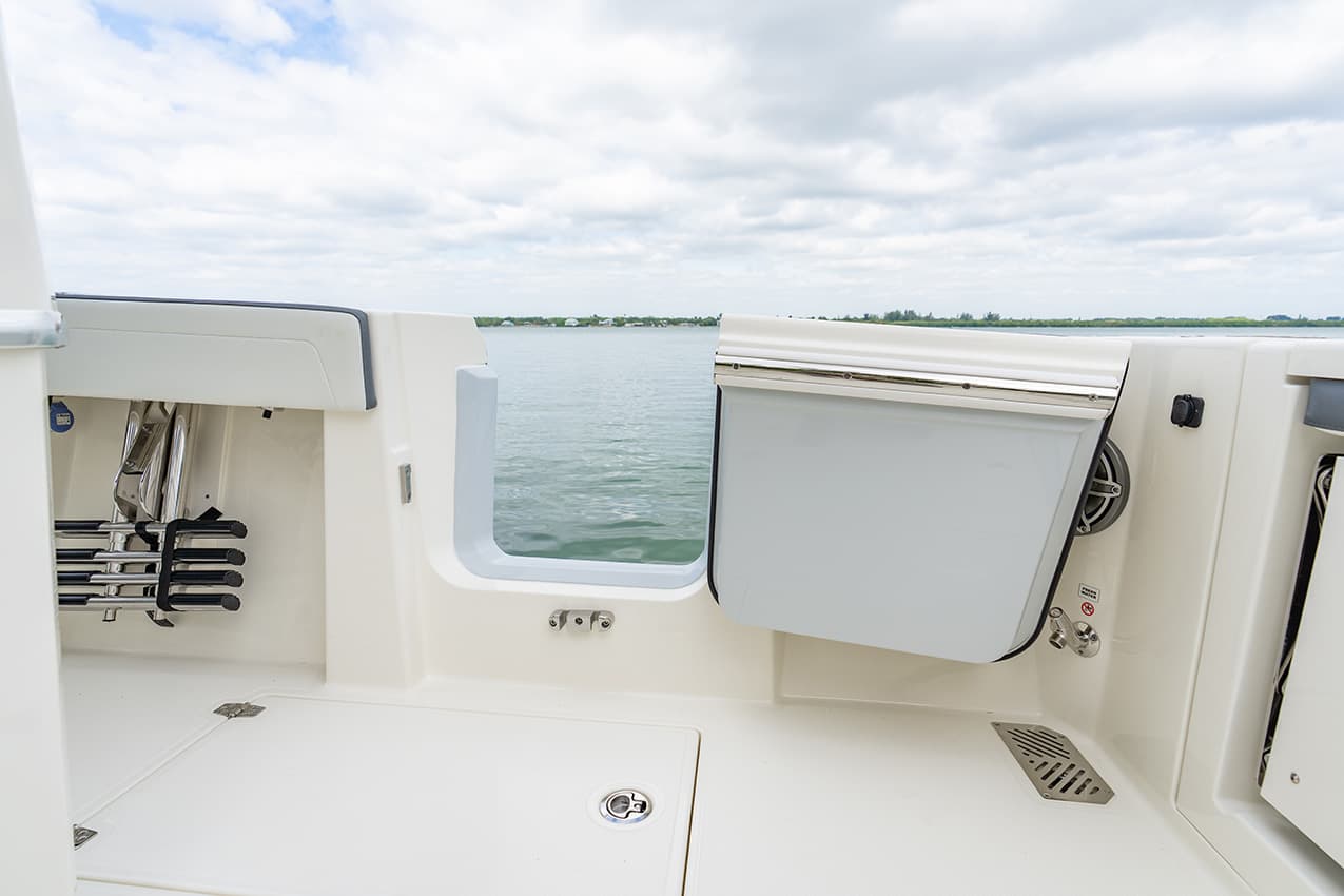 Everything at the helm is within reach, ergonomic and well-thought-out, giving you intuitive access to all of the key systems and plenty of cupholders. The helm seat also features a slide-out cooler that converts into a prep space or an extra seat at anchor.