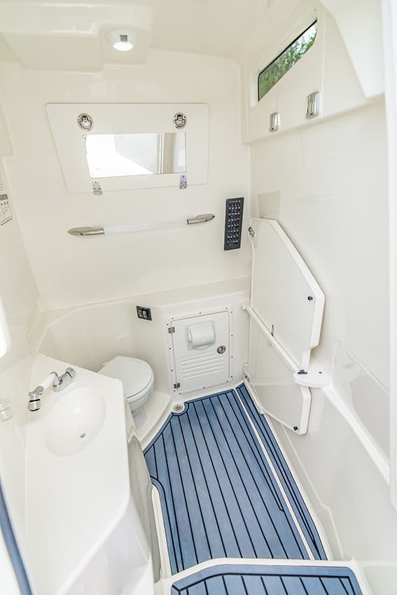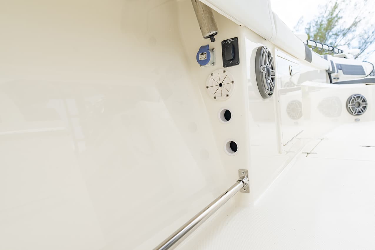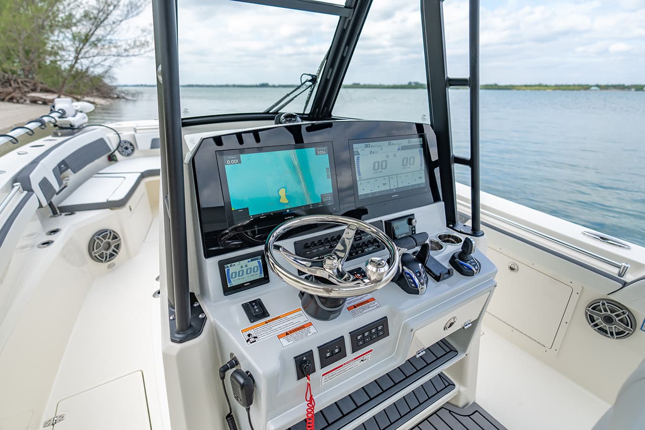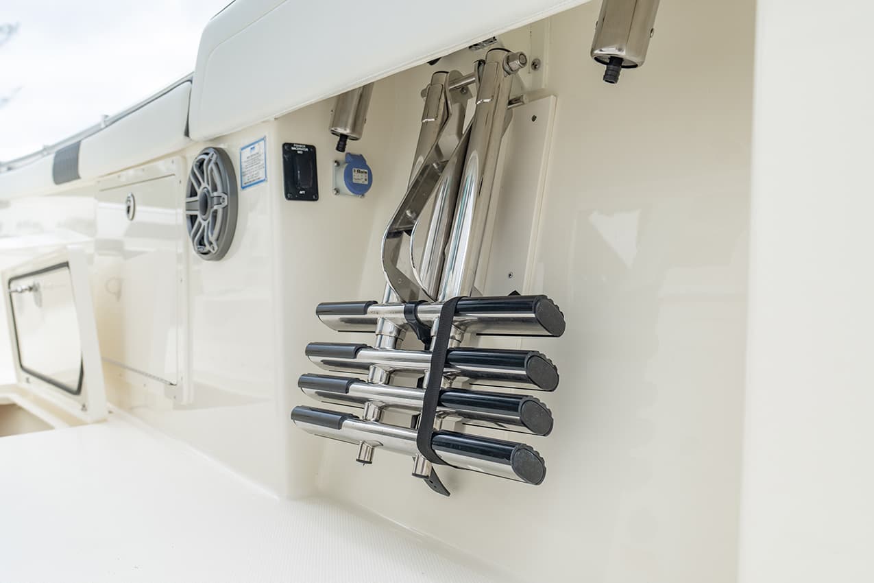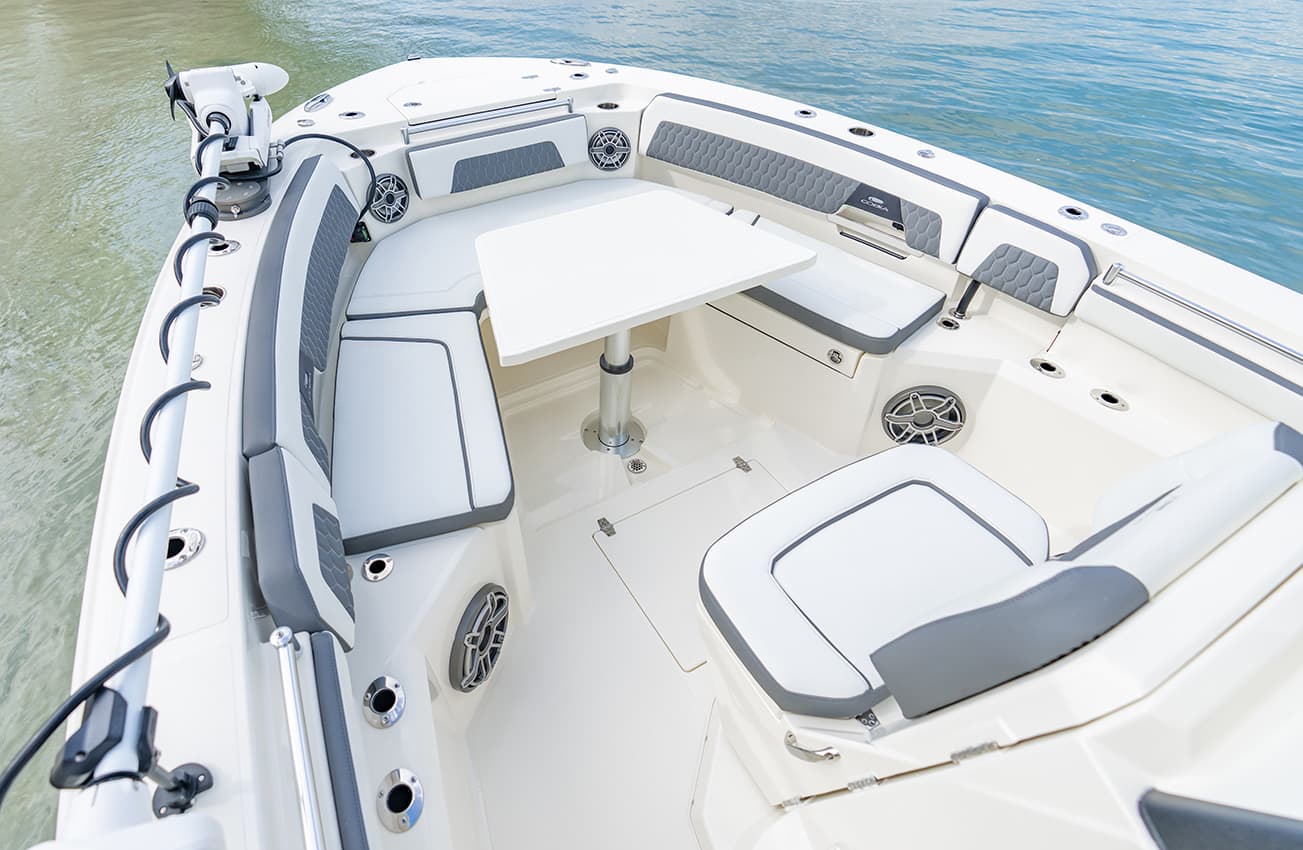 Everything at the helm is within reach, ergonomic and well-thought-out, giving you intuitive access to all of the key systems and plenty of cupholders. The helm seat also features a slide-out cooler that converts into a prep space or an extra seat at anchor.