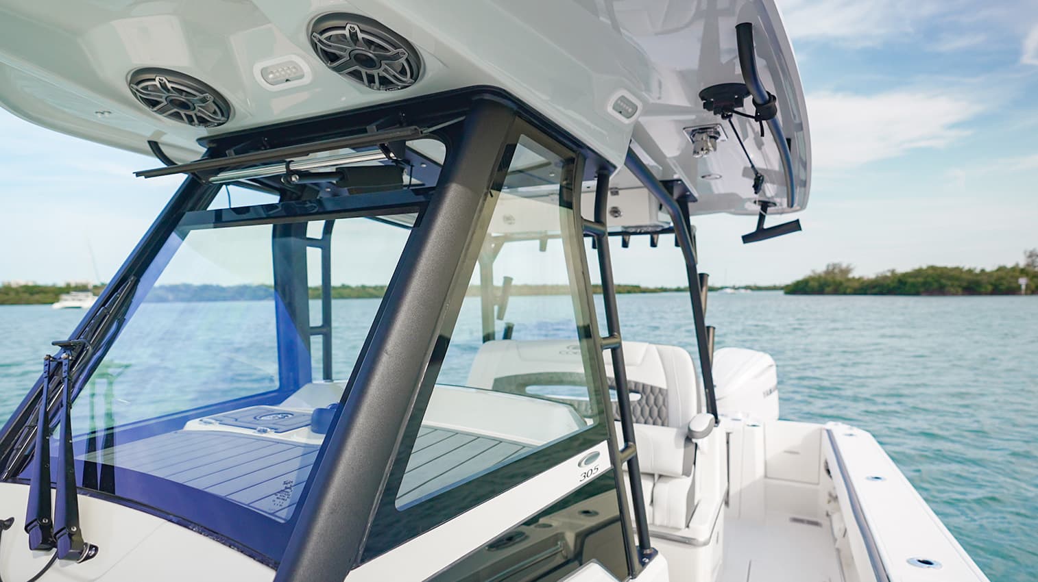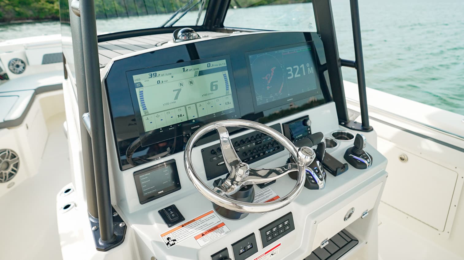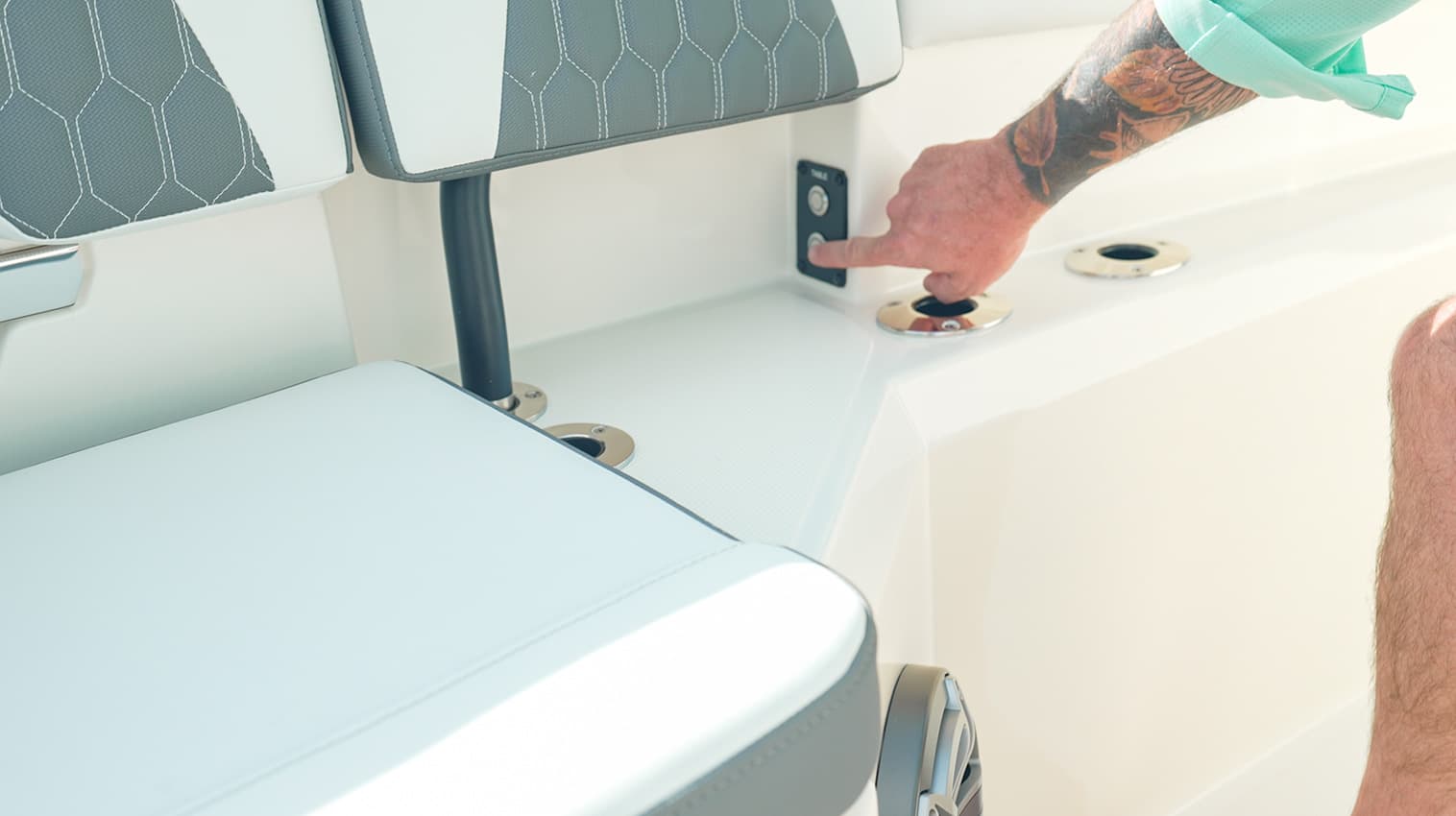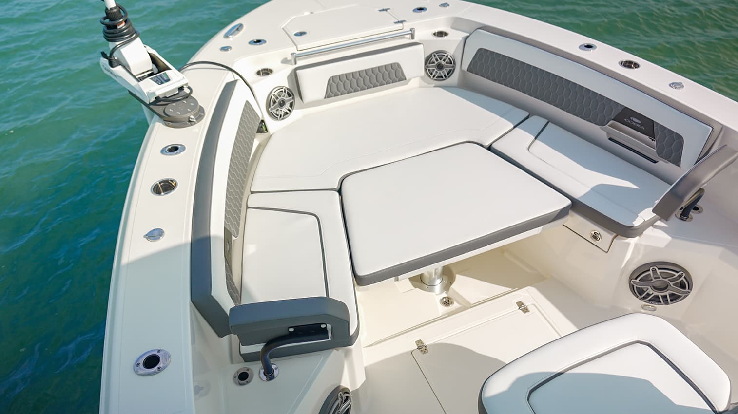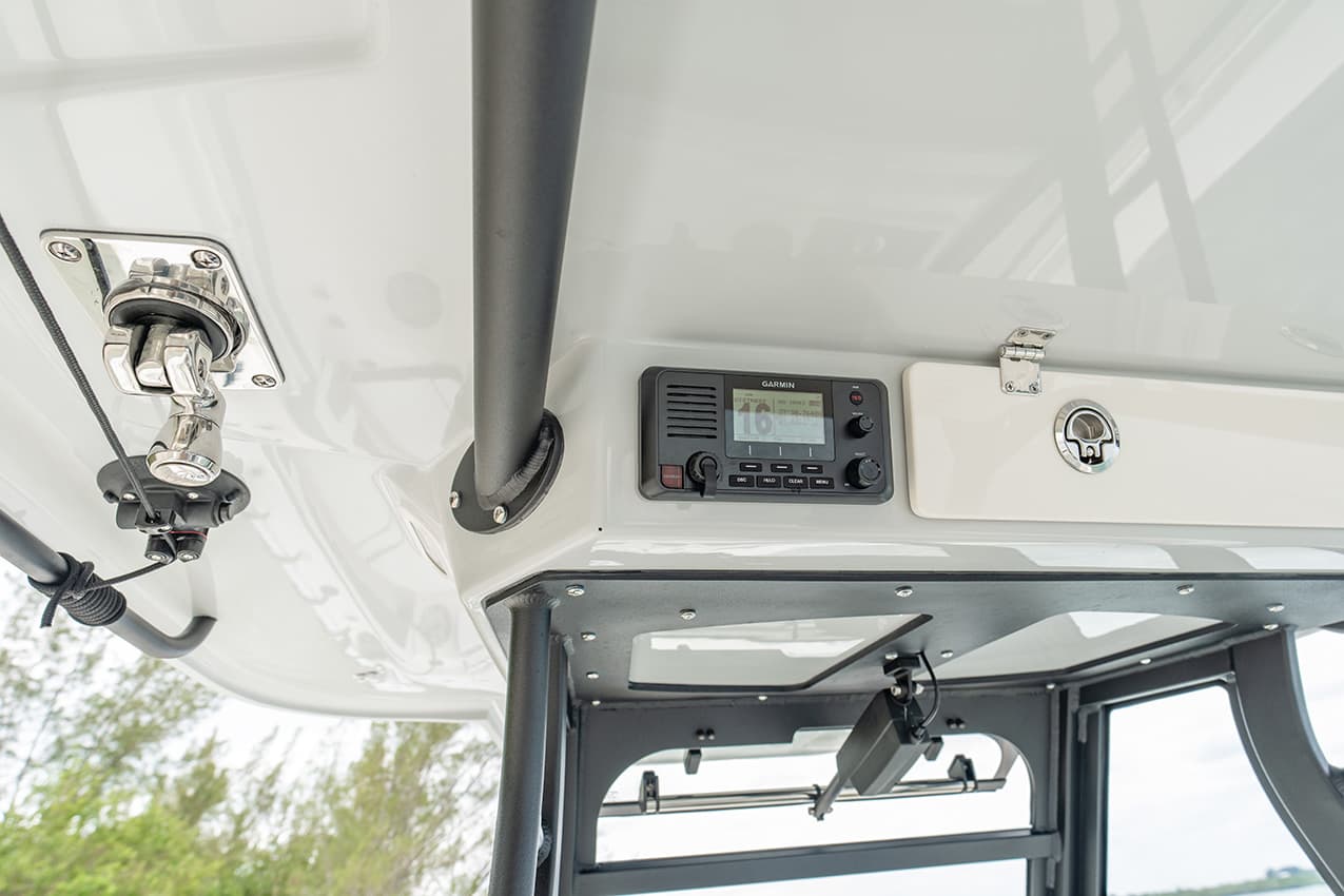 Everything at the helm is within reach, ergonomic and well-thought-out, giving you intuitive access to all of the key systems and plenty of cupholders. The helm seat also features a slide-out cooler that converts into a prep space or an extra seat at anchor.