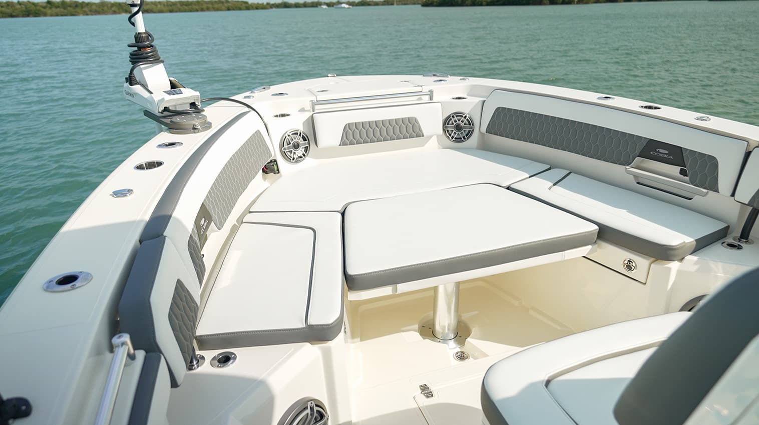 The wide-open bow layout with removable sun lounge insert provides seamless access to the trolling motor, anchor locker and bow cleats for safe dockage.