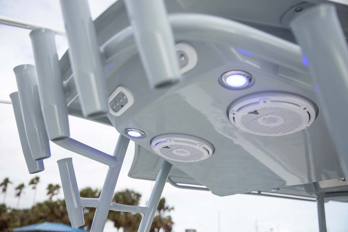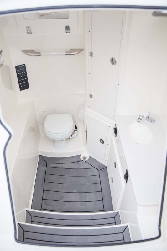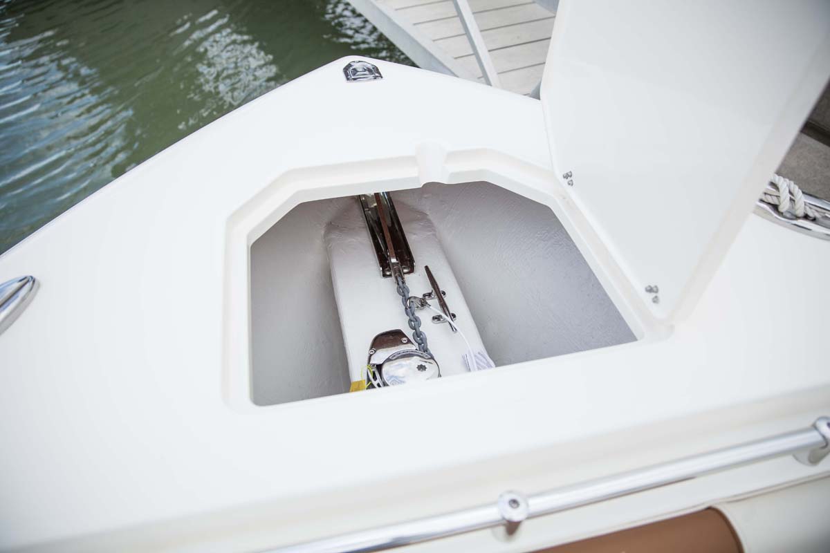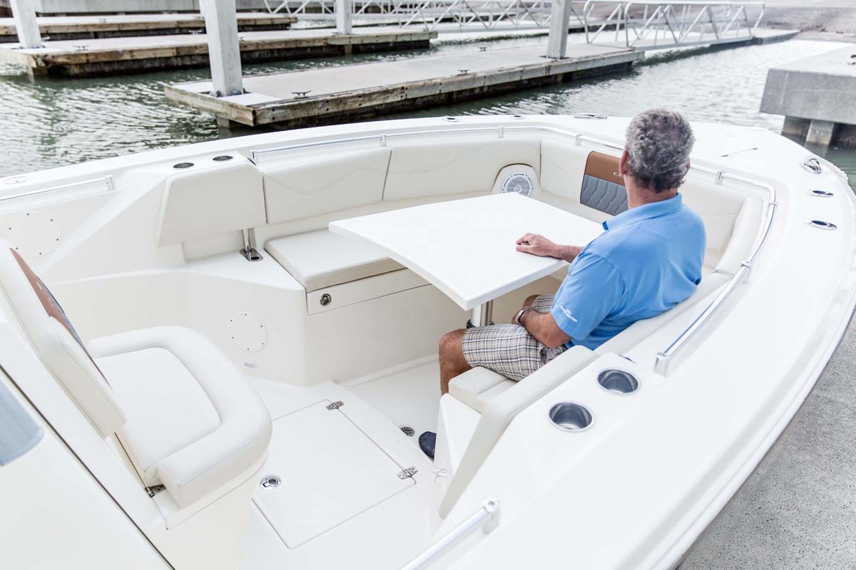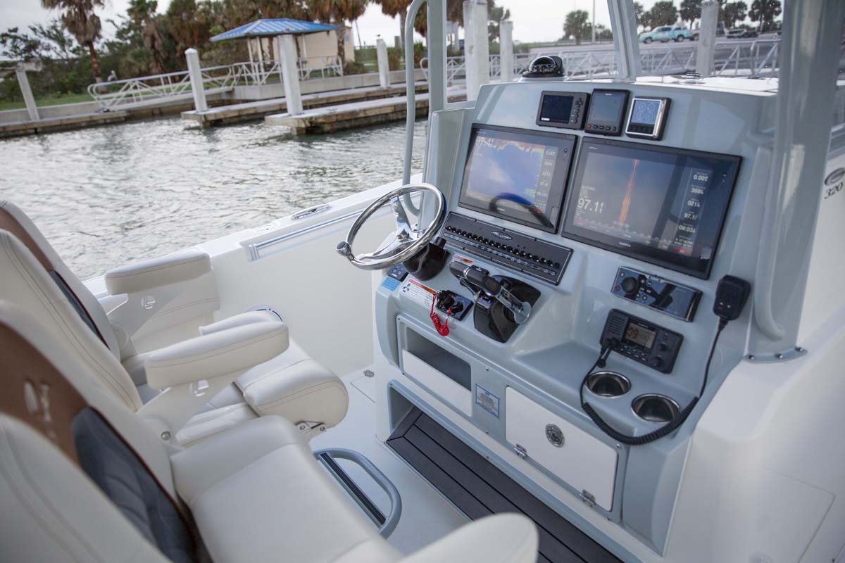 But the 320 CC is much more than a hardcore fishing machine. With elegant front seating, an electric bow table, inward-opening side door, optional integrated windshield, and a spacious walk-down forward entry head with 6’2″ of headroom, this boat puts a premium on riding in style. Combine all of this with the 320 CC hull’s top-of-class ride and it is sure to be a stunner whether on the trolling grounds or at the marina.