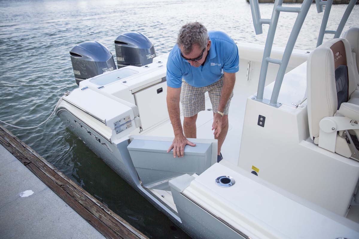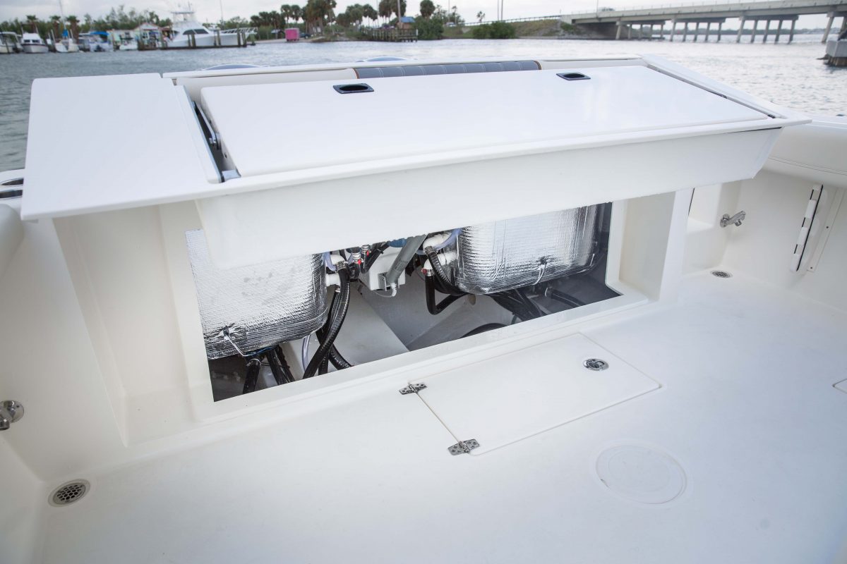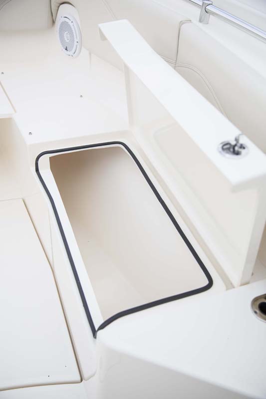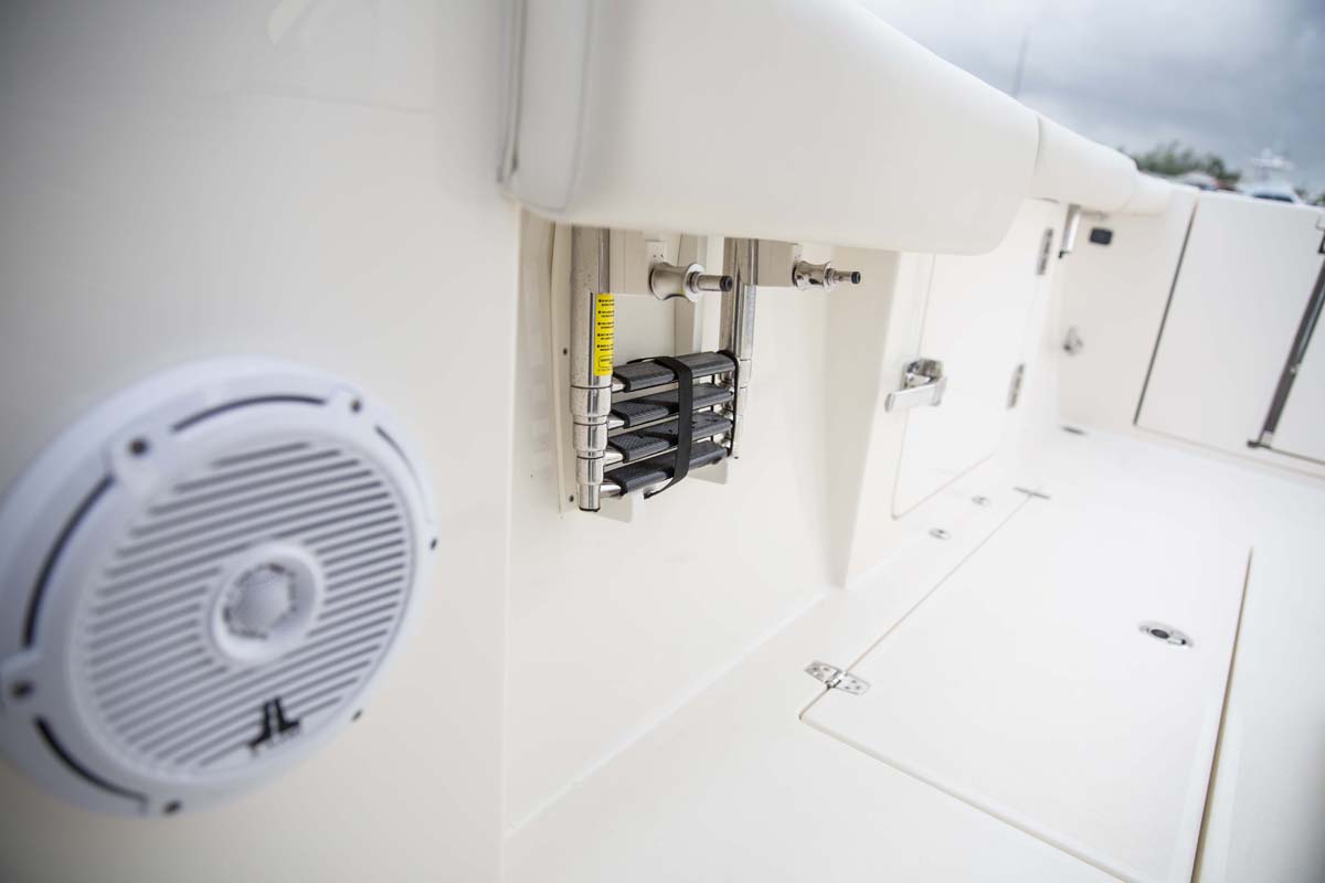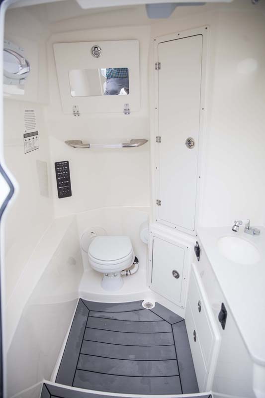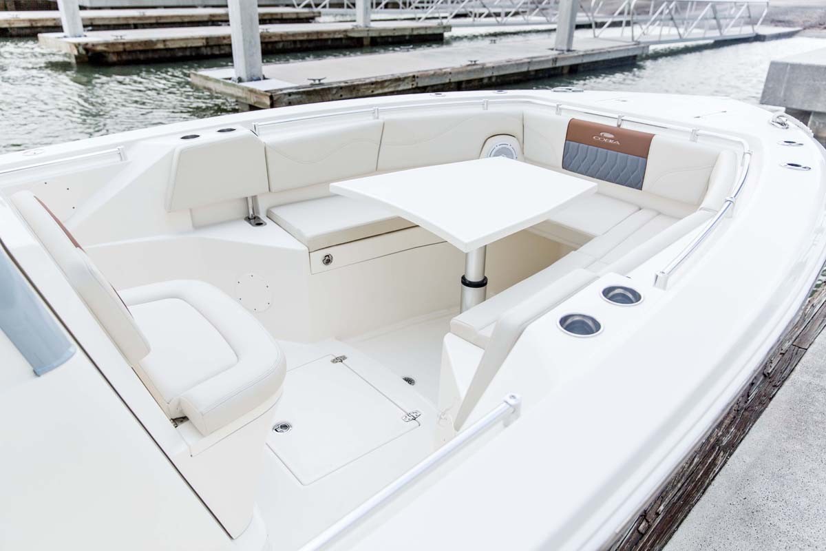 But the 320 CC is much more than a hardcore fishing machine. With elegant front seating, an electric bow table, inward-opening side door, optional integrated windshield, and a spacious walk-down forward entry head with 6’2″ of headroom, this boat puts a premium on riding in style. Combine all of this with the 320 CC hull’s top-of-class ride and it is sure to be a stunner whether on the trolling grounds or at the marina.