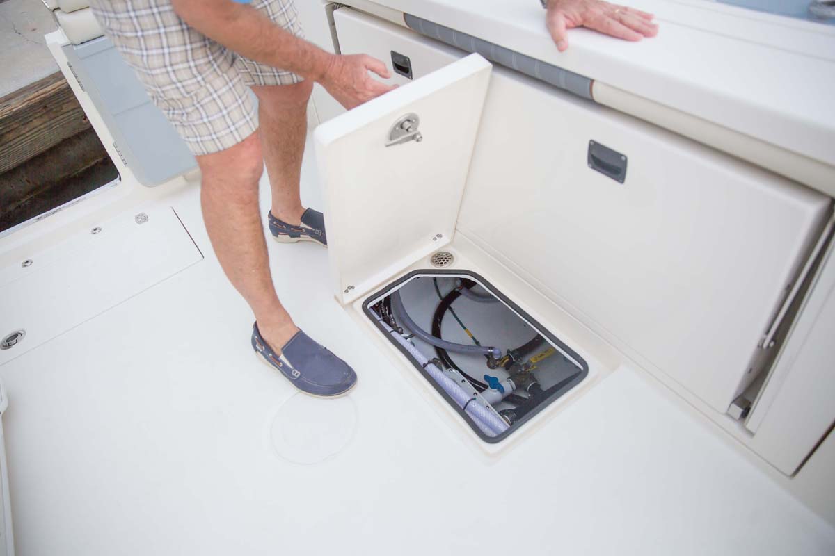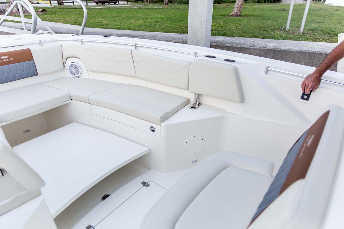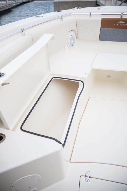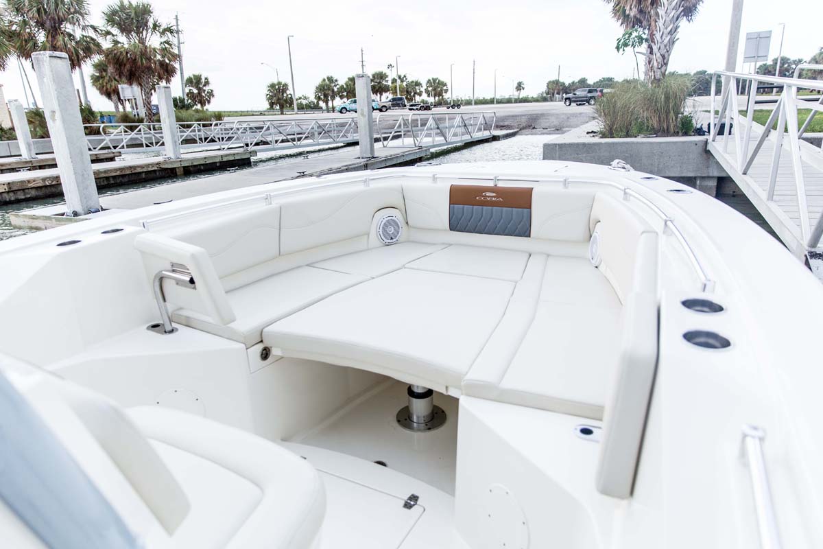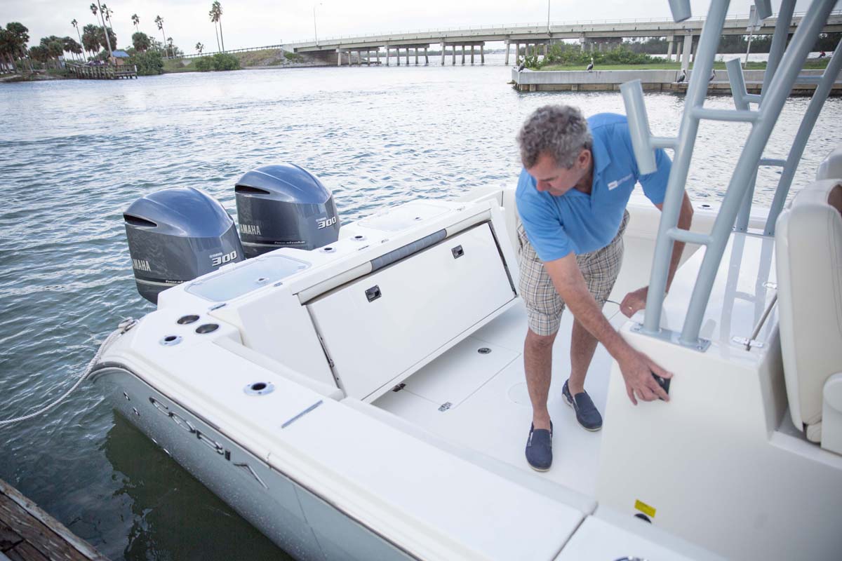 But the 320 CC is much more than a hardcore fishing machine. With elegant front seating, an electric bow table, inward-opening side door, optional integrated windshield, and a spacious walk-down forward entry head with 6’2″ of headroom, this boat puts a premium on riding in style. Combine all of this with the 320 CC hull’s top-of-class ride and it is sure to be a stunner whether on the trolling grounds or at the marina.