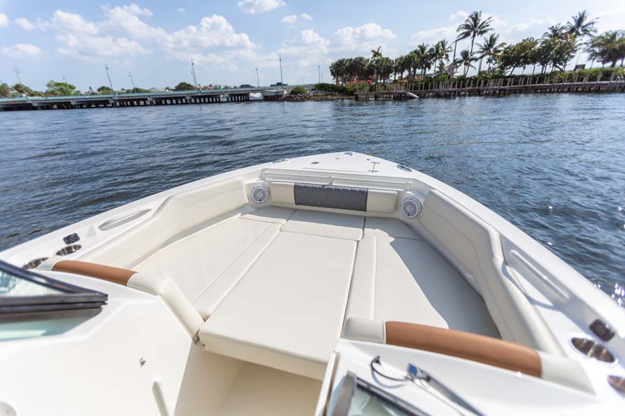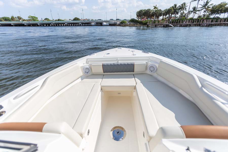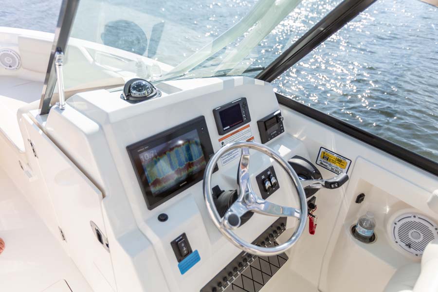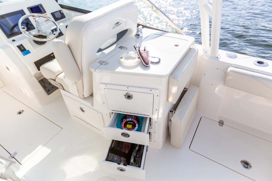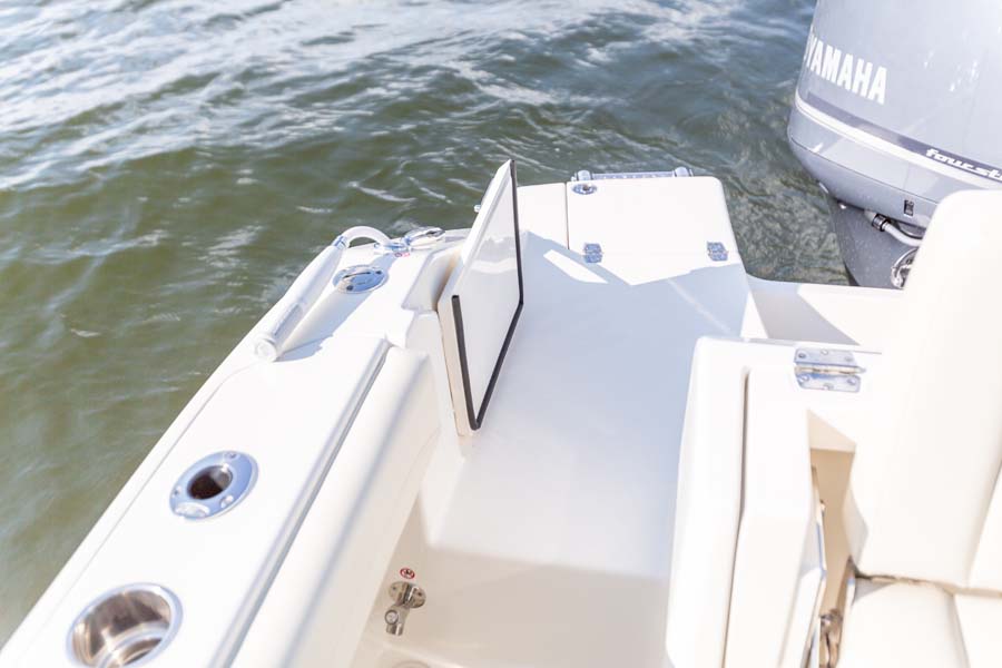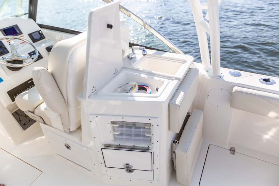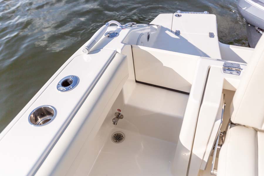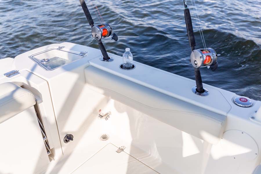 But just because comfort is at a premium it doesn’t mean that the serious angler is forgotten. This boat expertly melds all its soft touches with standard fishing features like dual in-floor 24-gallon fishboxes (macerators optional), a 22-gallon fully plumbed livewell, plenty of rod and tackle storage and a bait prep area with sink. Combine all this and there’s no better looking, more feature-rich and better performing 24-foot dual console on the water.
